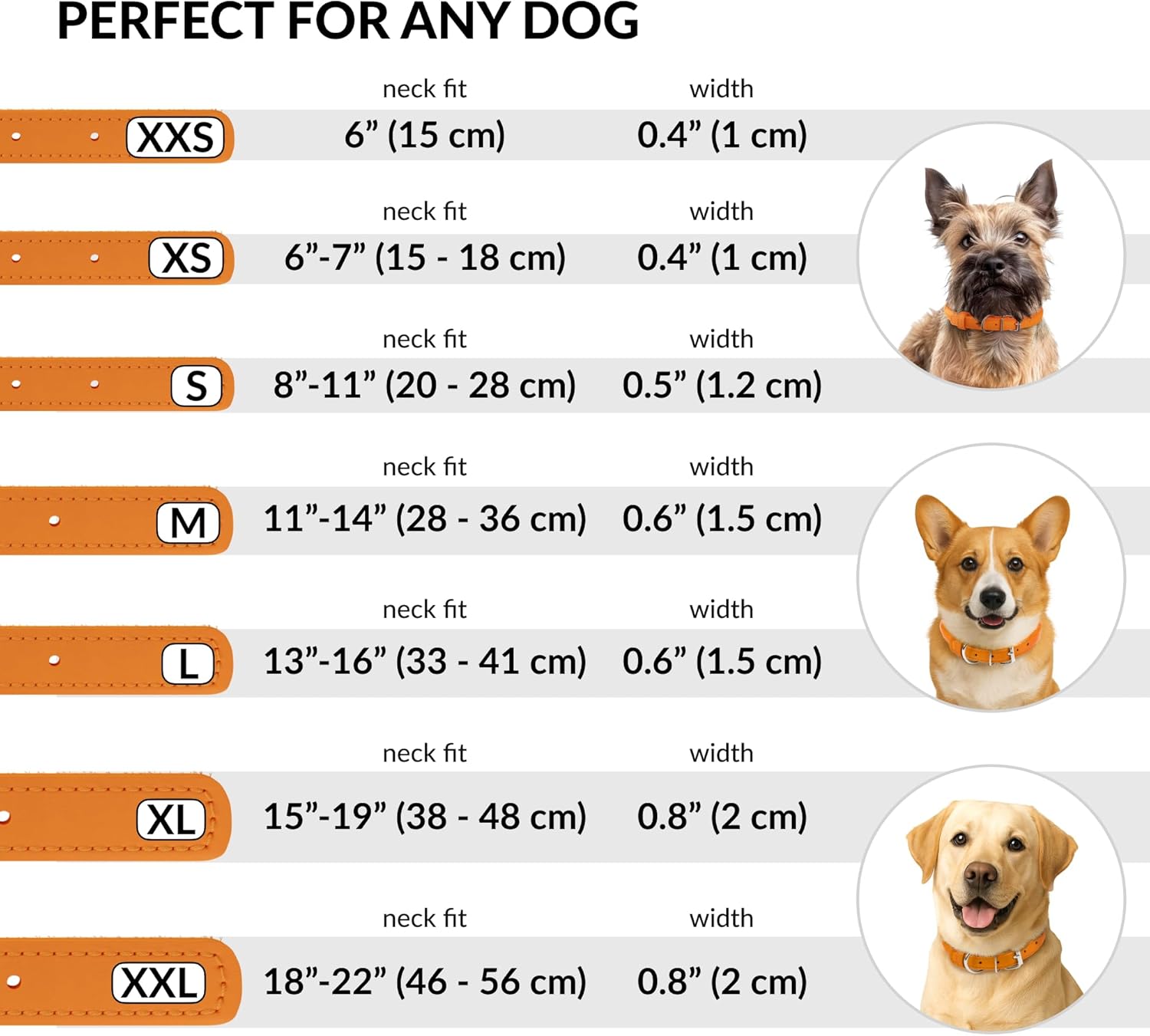 - SUITABLE FOR ALL BREEDS: Our dog collars for small dogs and big dogs come in a variety of sizes. Please check out our size chart before purchasing a leather collar for dogs. The dog collar leather is 0.8 inches wide, 21 inches long, and neck sizes of 16 - 20 inches.