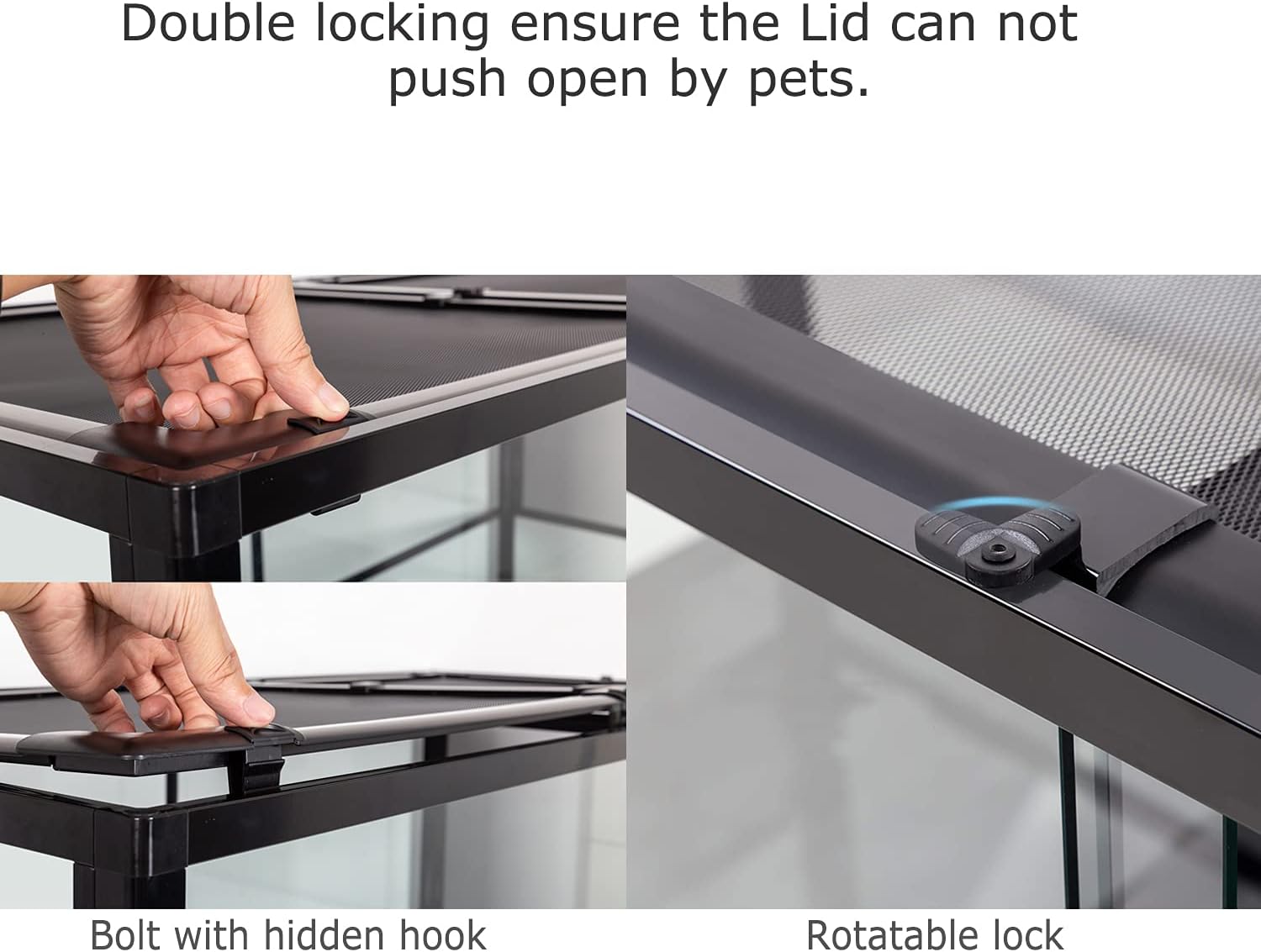 - ăAnti EscapeăSecurity buckle on the lid ensure the tank closed tightly, prevent your reptile amphibian chameleon pets from escaping. And the security lock avoid the doors open accidently by your kids and keep your kids safe.