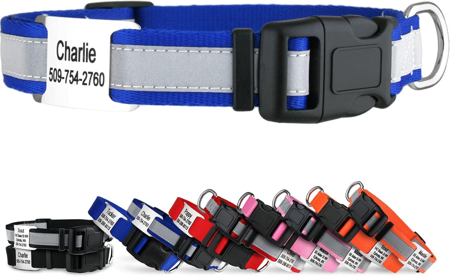 GoTags Reflective Personalized Dog Collar with Nameplate, Adjustable Dog Collar with Custom Engraved Steel Slide On Pet ID Tag, Silent, No Noise Dog Tag for Large Medium or Small (Blue, Medium)