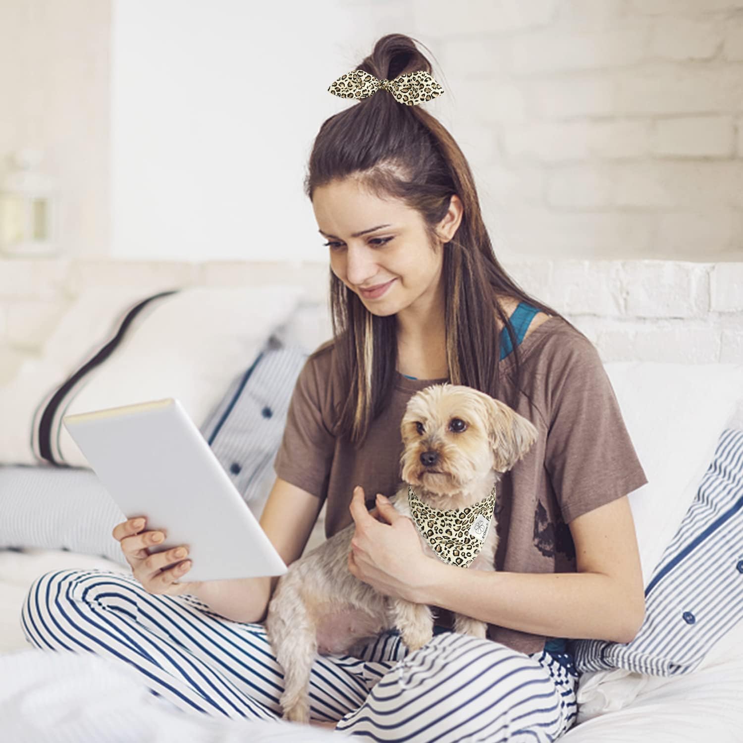 E-Clover Dog Bandanas & Matching Scrunchie Set Leopard Dog Bandana Bibs Washable Kerchief Scarf for Puppy Small Dogs & Owner