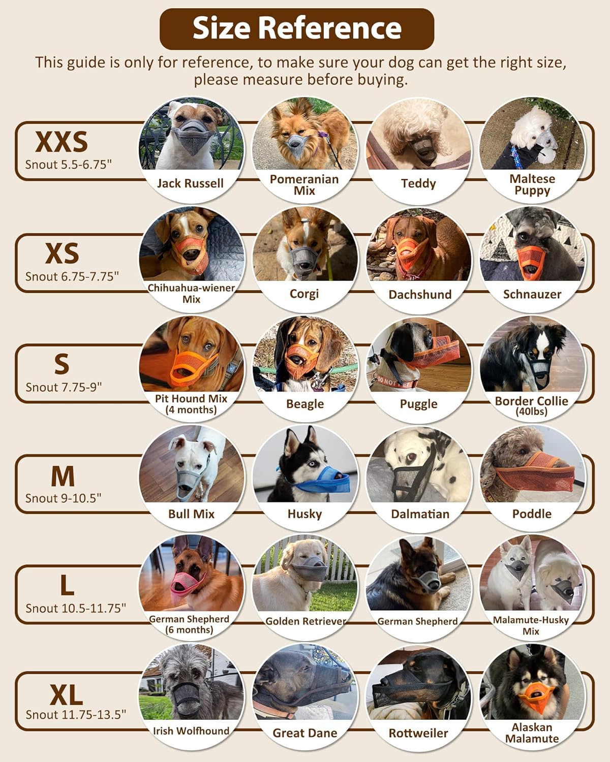 - Dog Muzzle for Small Dogs: The selected size is XXXS, with snout circumference of 4.25"–5.5". Suitable for Mini Poodles, Malteses, etc. Every dog’s snout is unique, please Measure Before Purchasing. Don't select a size based on breed or previous orders. If your dog's measurements are between two sizes, please choose the smaller size. (Note: Not for fierce dogs, overactive dogs, or short-snout dogs.)