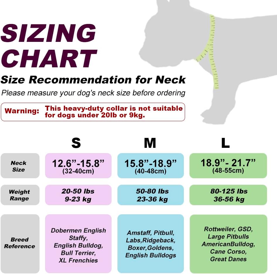 - Metal Collar for Dogs: The dog collars for small dogs with 4 adjustable points, easy to adjust the comfortable fit and attach to dog leash or dog collar. Please follow the size chart to measure your dog carefully before purchasing to ensure the collar is fit well to your dog. For dog neck (L: 18.9”-21.7”, M: 15.8”-18.9”, S: 12.6”-15.8”)