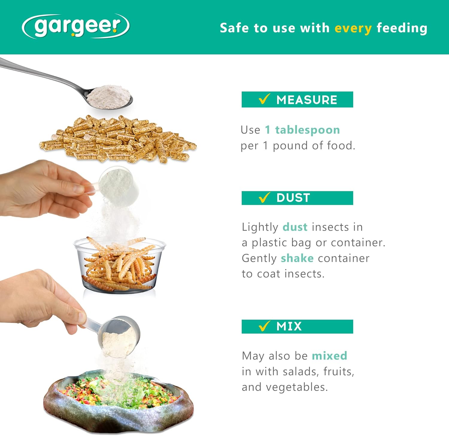 - STICK WITH US. Gargeer calcium ultrafine particles stick better to feeder insects and mix well into salads. DO NOT ADD DIRECTLY INTO WATER.