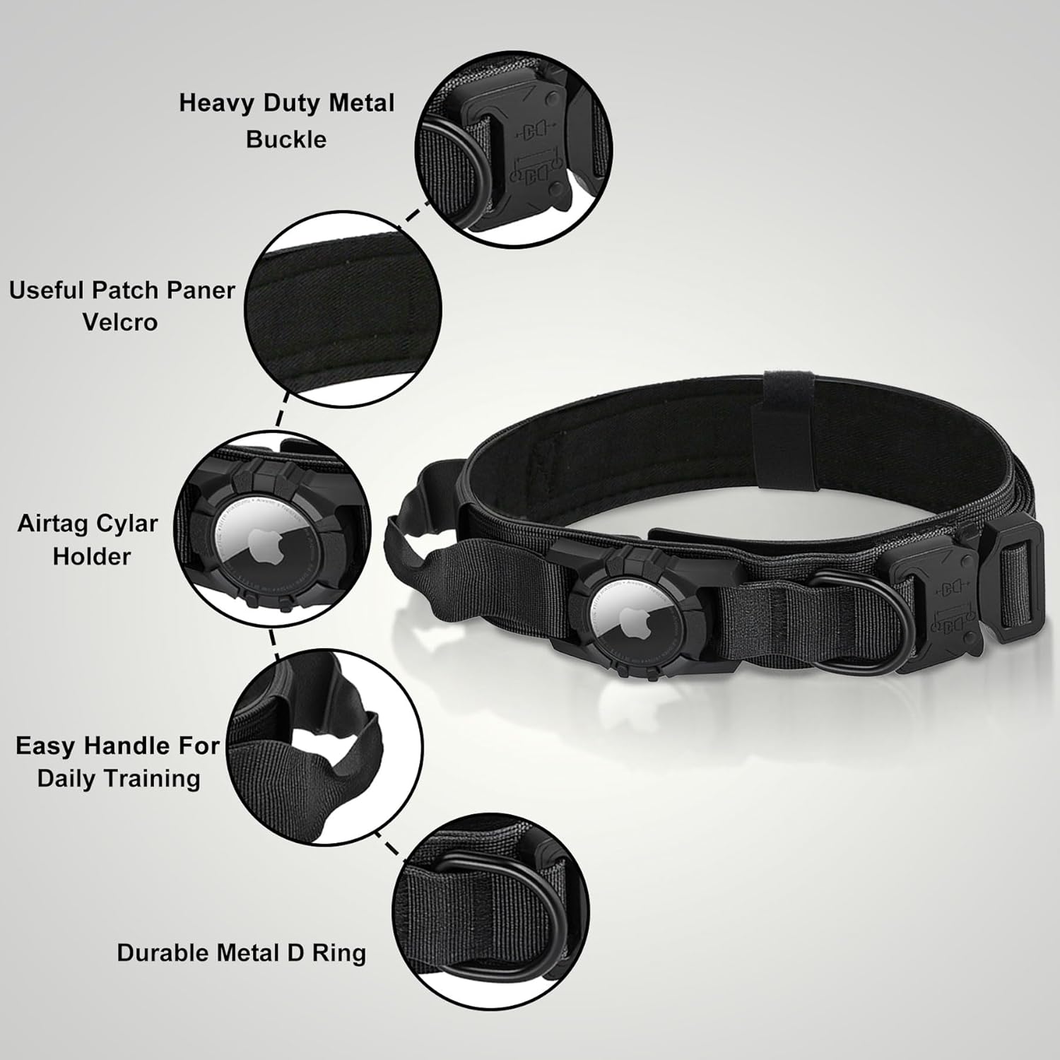 Tactical AirTag Dog Collar Leash Set - Heavy Duty, Adjustable GPS Collar Compatible with Apple AirTag, with Holder & Control Handle for Medium/Large Dogs [ Black, L ]