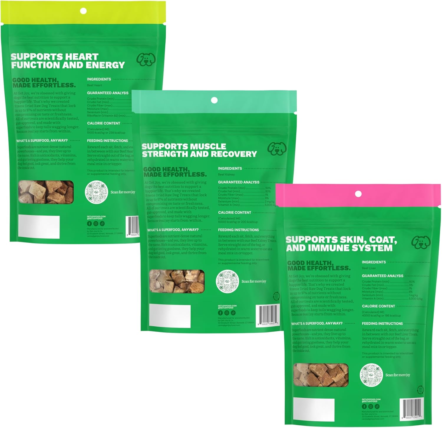 Get Joy Freeze Dried Superfood 100% Beef Heart, Kidney, Liver Dog Treats Variety Pack, 4 Ounce (Pack of 3), Single Ingredient Organ Meat, High Protein, Grain Free, Gluten Free, Made in USA