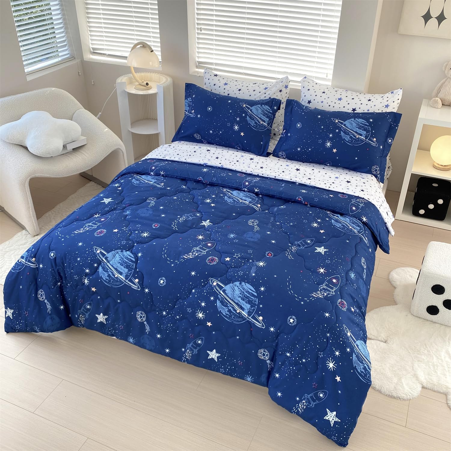 7 Piece Boys Space Comforter Set Full Size Bed in A Bag Star Rocket Galaxy Universe Planets Bedding Set for Kids Teens Girls Microfiber Blue Quilt All Season