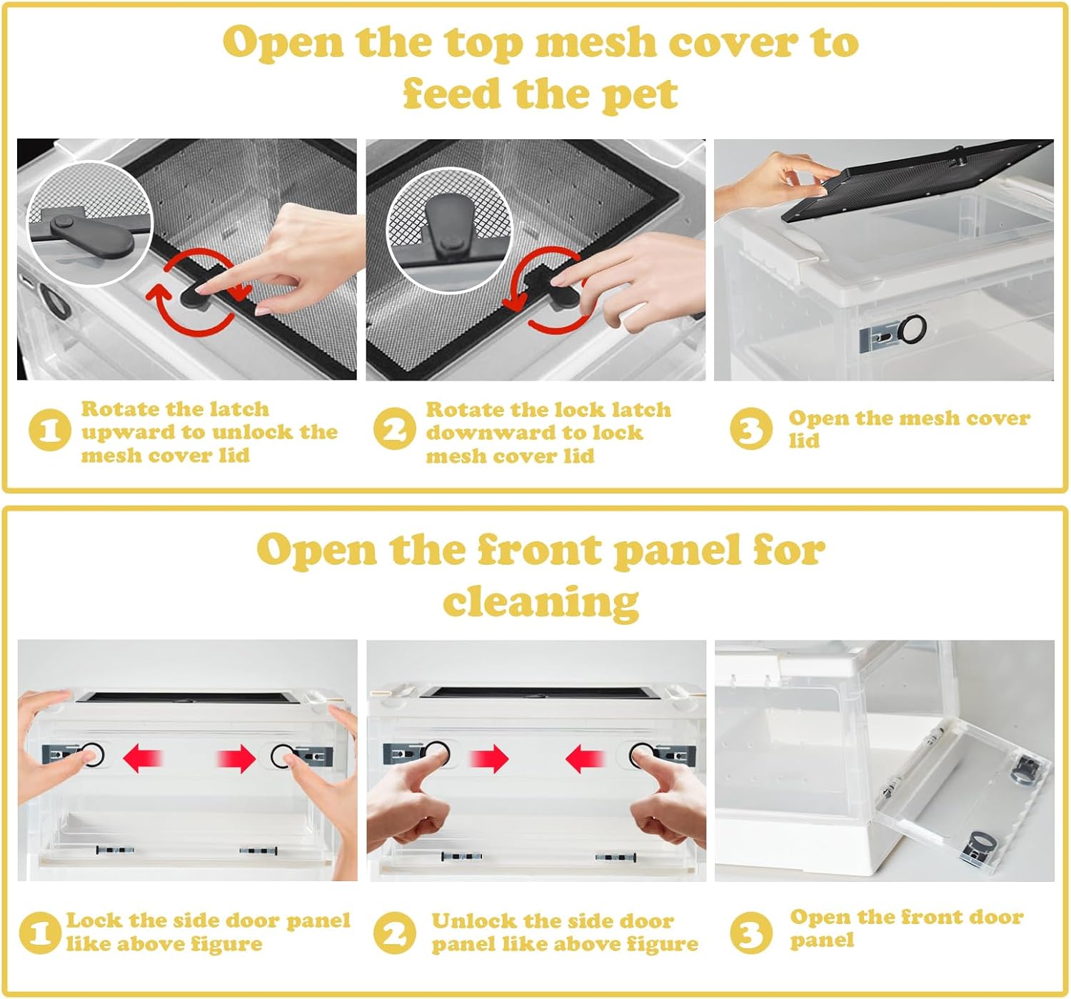 - Clever Design:Portable small snake terrarium is designed with multiple small air holes for ventilation there is a breathable panel mesh cover on the top,can be opened,closed,and disassembled,ventilation and breathability,ensuring air circulation in the internal habitat,multiple vents at the bottom and sides allowing pets to breathe fresh air. front panel can be opened or closed,convenient cleaning of pet houses,four rolling pulleys at the bottom,carrying out, and not easily broken