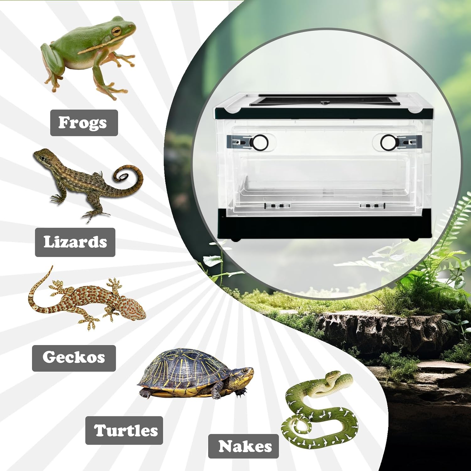 - Appropriate Size:Transparent reptile breeding box size is:15.6x11.6x 9.5 inch/39.62x29.46x24.13 cm. There is enough crawling space to move around,small and lightweight,easy to carry and move. Reptile cage safety lock on the upper cover,it can prevent pets from escaping.allowing light and ultraviolet rays to penetrate,there is a feeding port above the lidconvenient feeding,with a dual opening design 360 degree observation of small animal behavior