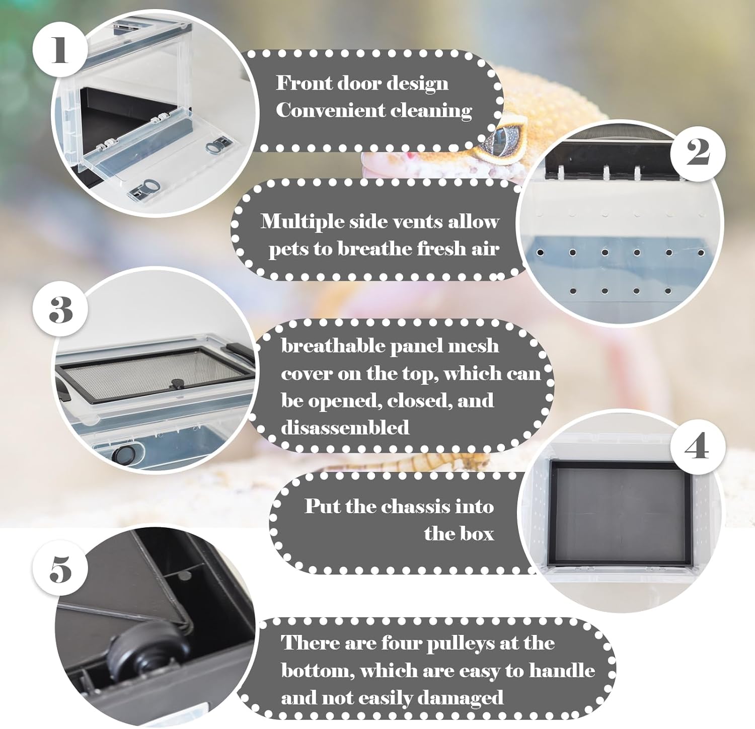 - Clever Design:Portable small snake terrarium is designed with multiple small air holes for ventilation there is a breathable panel mesh cover on the top,can be opened,closed,and disassembled,ventilation and breathability,ensuring air circulation in the internal habitat,multiple vents at the bottom and sides allowing pets to breathe fresh air. front panel can be opened or closed,convenient cleaning of pet houses,four rolling pulleys at the bottom,carrying out, and not easily broken