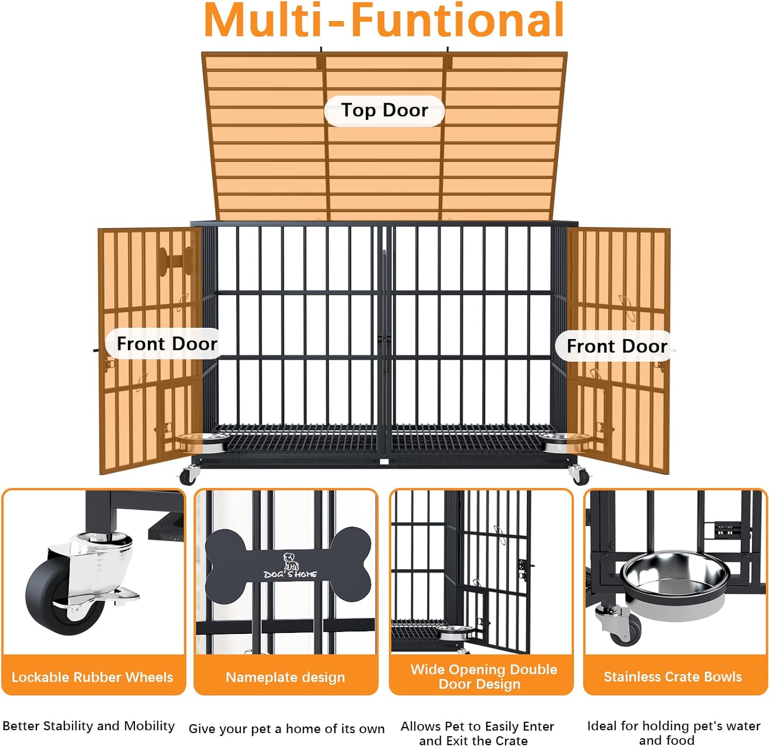 - 【Practical & Easy to Move and Clean】The dog crate comes with four smooth rolling locking wheels for easy movement and fixation, you can easily move the crate to different positions as needed. The dog crate comes with two pull-out tray for easy removal and cleaning. It also comes with a safety latch to avoid your smart dog from opening the iron door, effectively protect your pet.