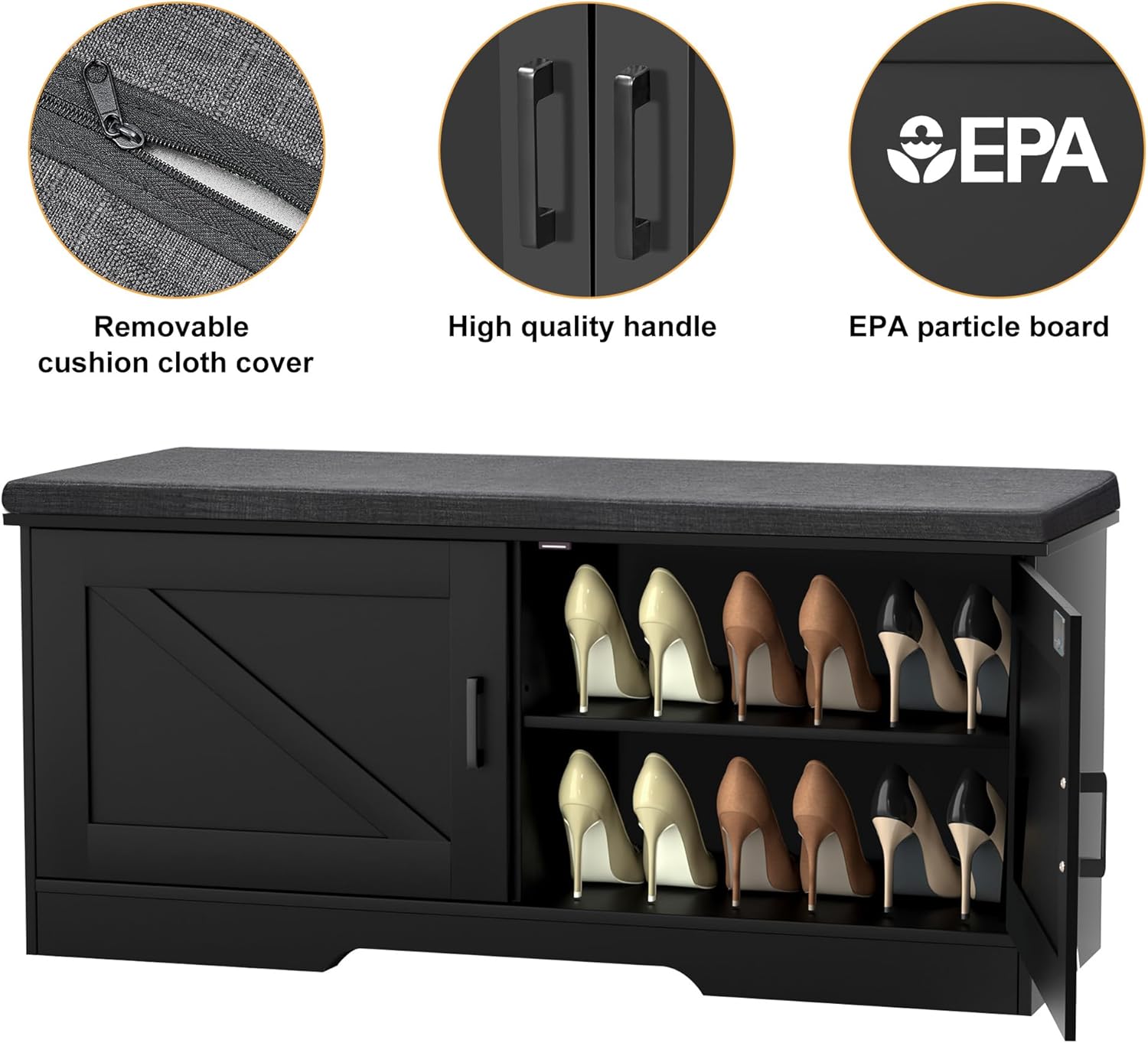 2-Tier Storage Bench, Shoe Bench with Padded Seat Cushion, Entryway Bench with 2 Barn Doors, Adjustable Shelf, 13.8" D x 39.4" W x 17.7" H, for Entryway, Living Room, Bedroom, Black