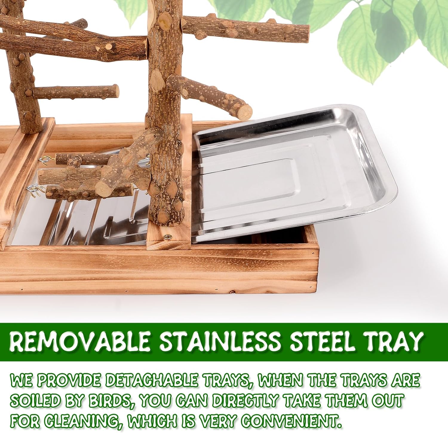 - Easy to Clean and Maintain: The removable tray make it easy to clean droppings and debris from the bird playground. Simply wipe them with a damp cloth and place them in a sunny spot to dry. This helps maintain a healthy and sanitary environment for your bird