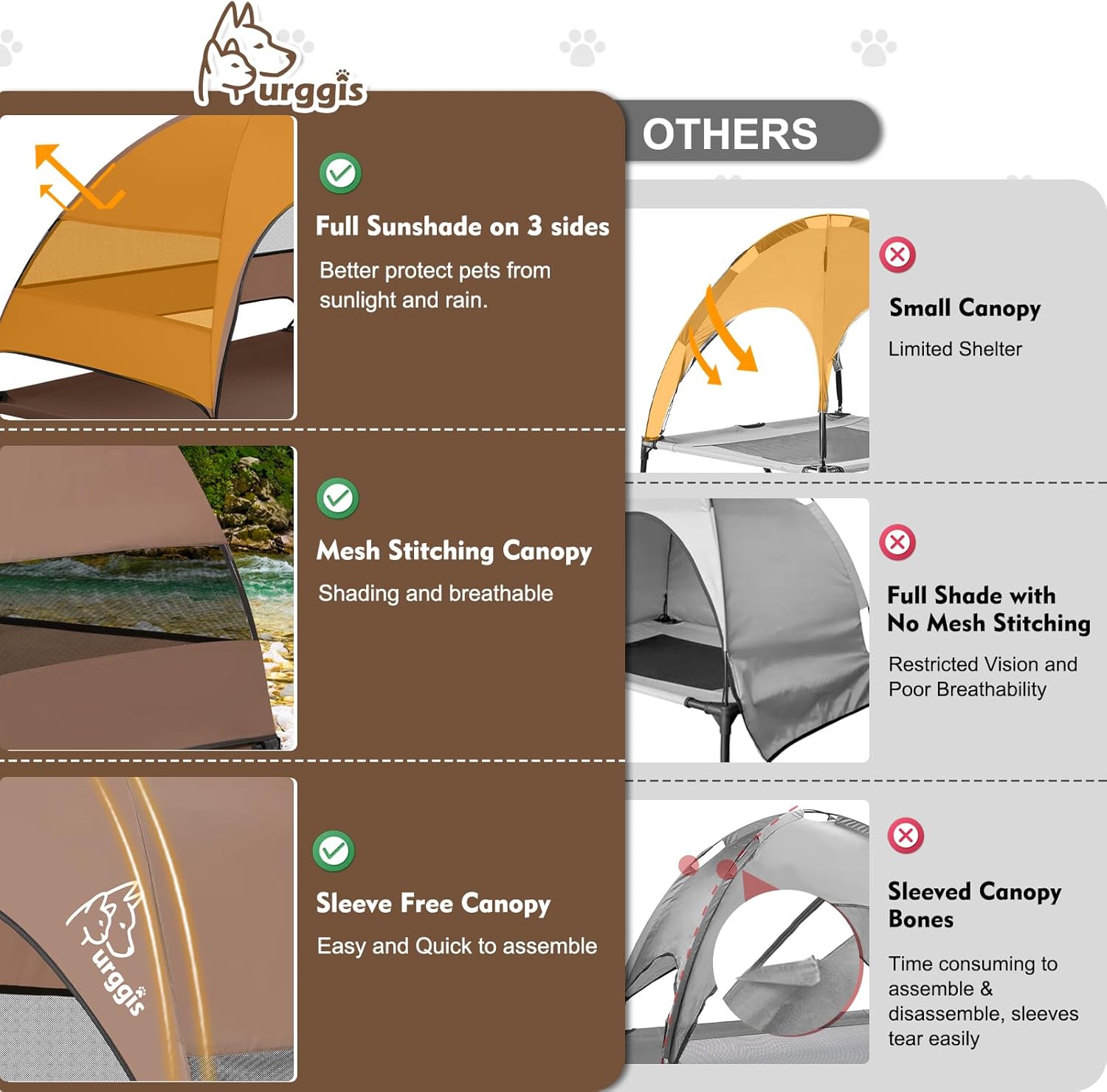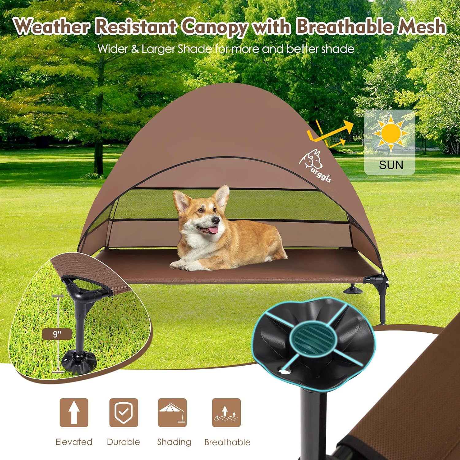 - Elevated Pet Cot With Anti-Scratch Breathable Bed Mat: Features a high density teslin breathable meshing bed mat, this bed is anti-scratch, breathable and odorless, no sticking hair and can be easily cleaned up by wiping or hosing off and keep clean. With this elevated dog bed with a large canopy, our furry kids will be better protected from ground heat and scorching sun in summer and keep dry in light rain (cover is recommended in heavy rain), let them have a cozy summer!