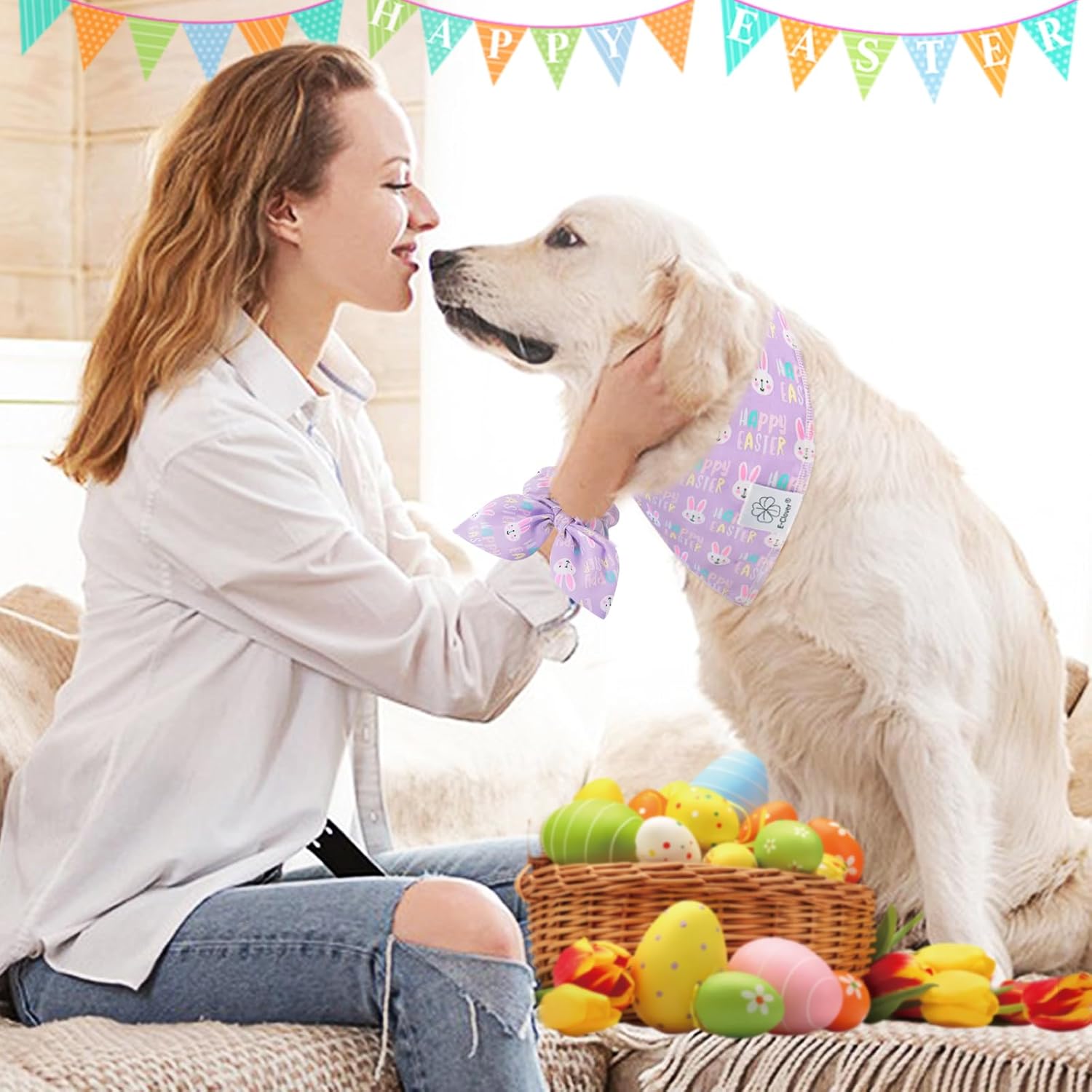 - Matching Dog and Owner Clothes- Itβs so cute and unique, dog mom and dogs are wearing the matching costume together. When traveling, daily walking, or taking photos, adorable dog bandana matching scrunchie is both funny and personalized dog accessories. The scrunchie can be worn as a wrist accessory, or as a ponytail holder hair band. Beautiful happy easter dog bandana matching pet set is nice spring themed photo props.