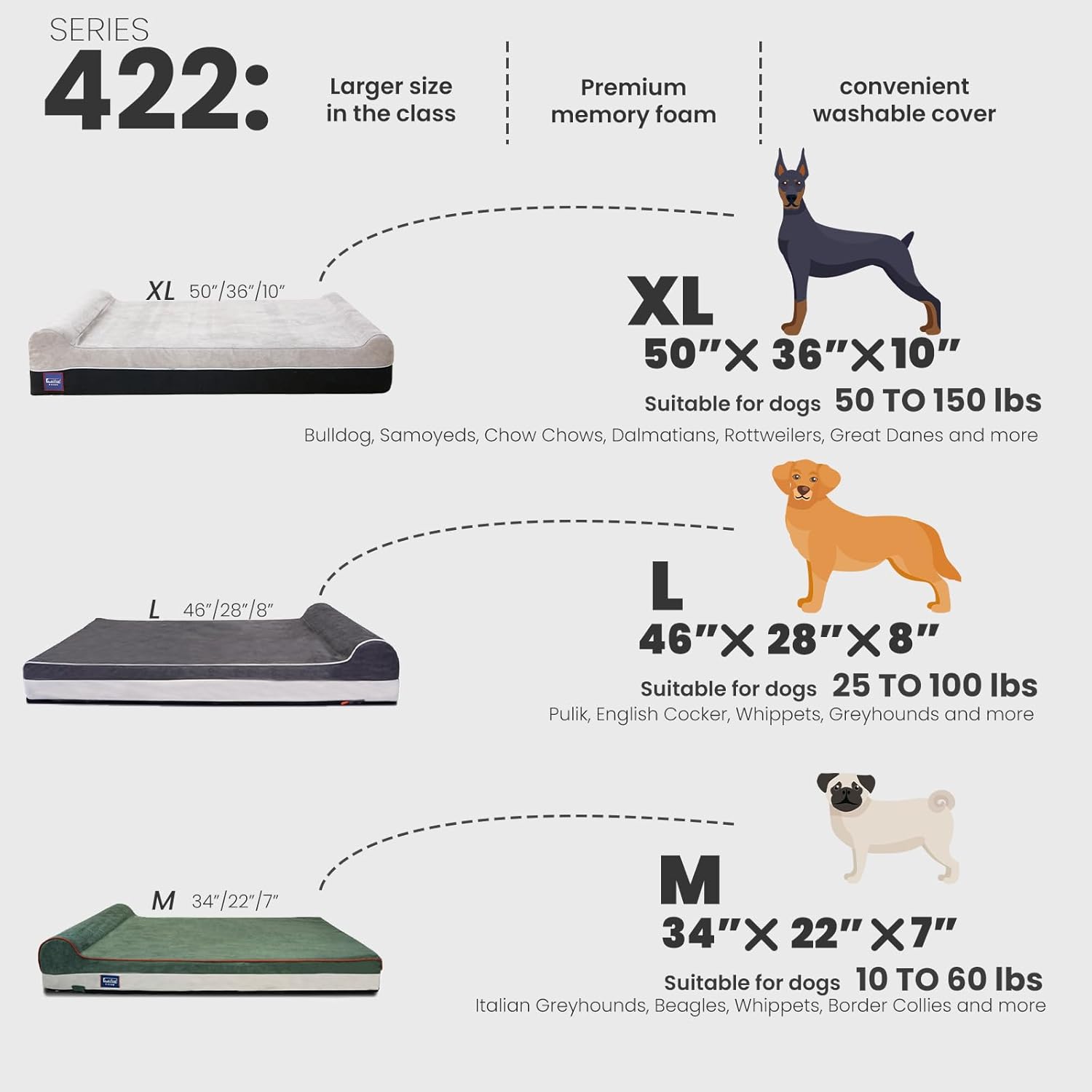 - Extra Large Bed 50"L x 36"W x 10"H dimensions for dogs 200 pounds and under. Laifug foam bed will become your pets favorite sleeping spot