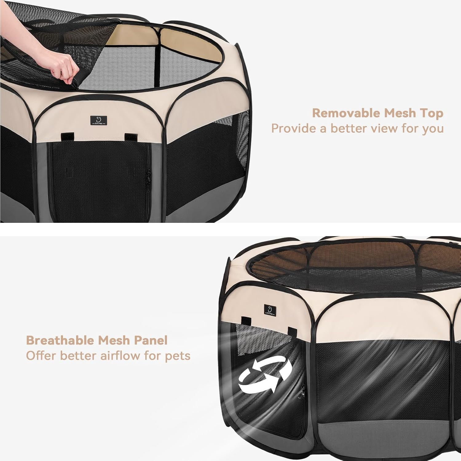 - 【Removeable Top & Waterproof Bottom】The top of this portable dog playpen can be removed by zipper so you can view your pets clearly. While the bottom is coated with waterproof PVC layer for easy cleaning.