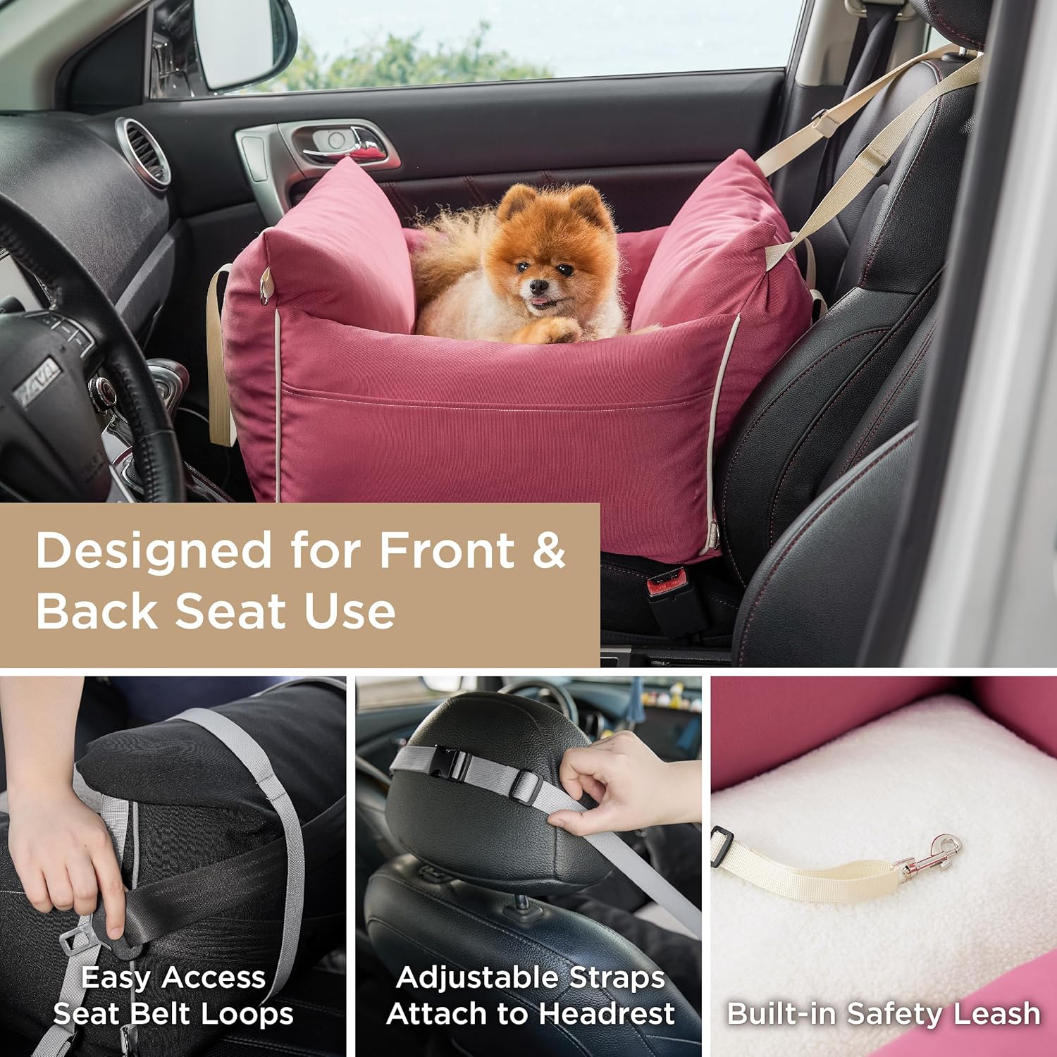 Lesure Small Dog Car Seat for Small Dogs - Waterproof Dog Booster Seat for Car with Storage Pockets and Clip-On Safety Leash and Thickened Memory Foam Filling, Pet Travel Carrier Bed Rose Red