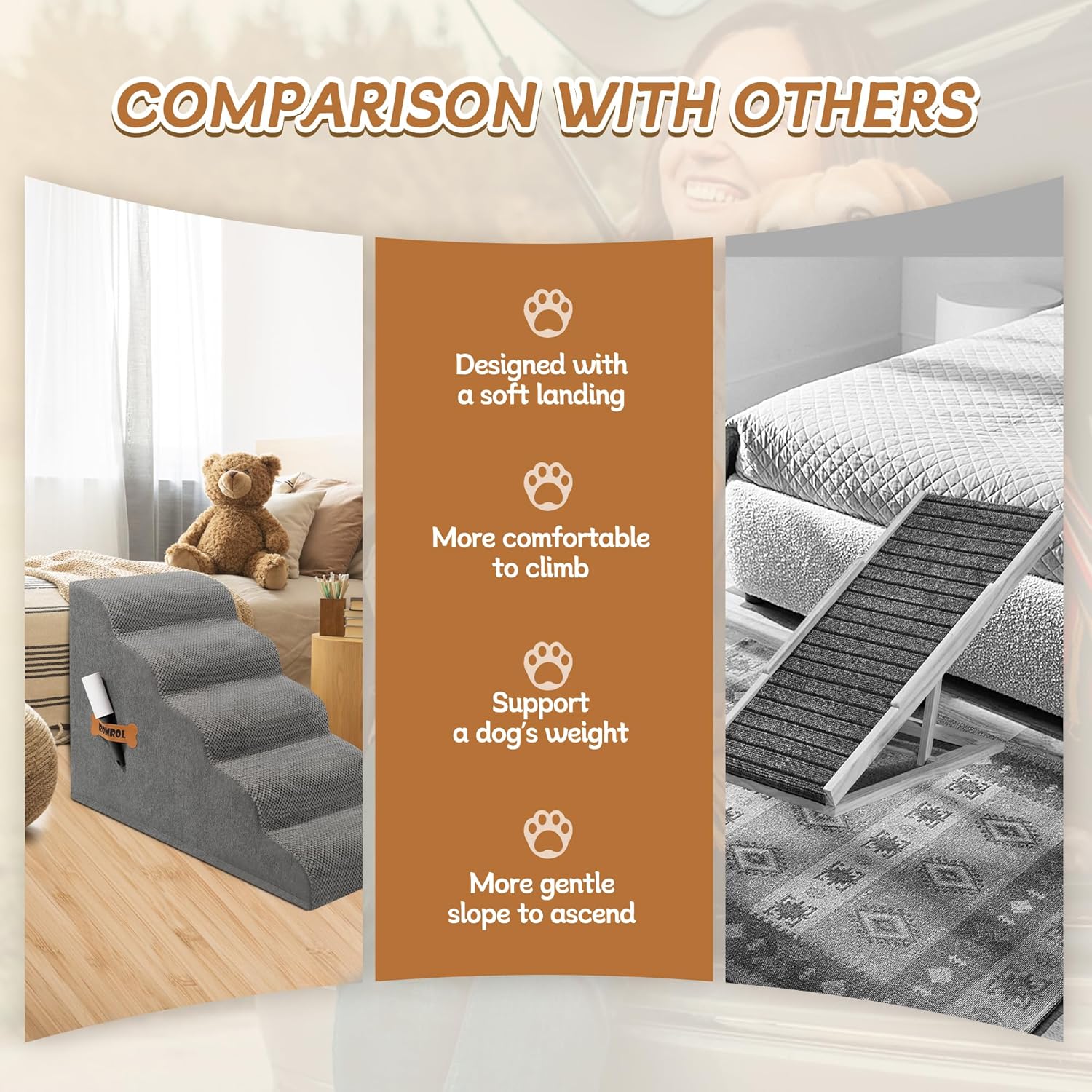 - DOG-FOCUSED DESIGN: Different from traditional right-angle dog stairs, this more scientifically designed slope dog ramp is more suitable for puppies and pets with knee joint injuries.The size of the 5-steps pet stairs is 15.7"x32.6"x22", whether it is the bedside, sofa or bay window