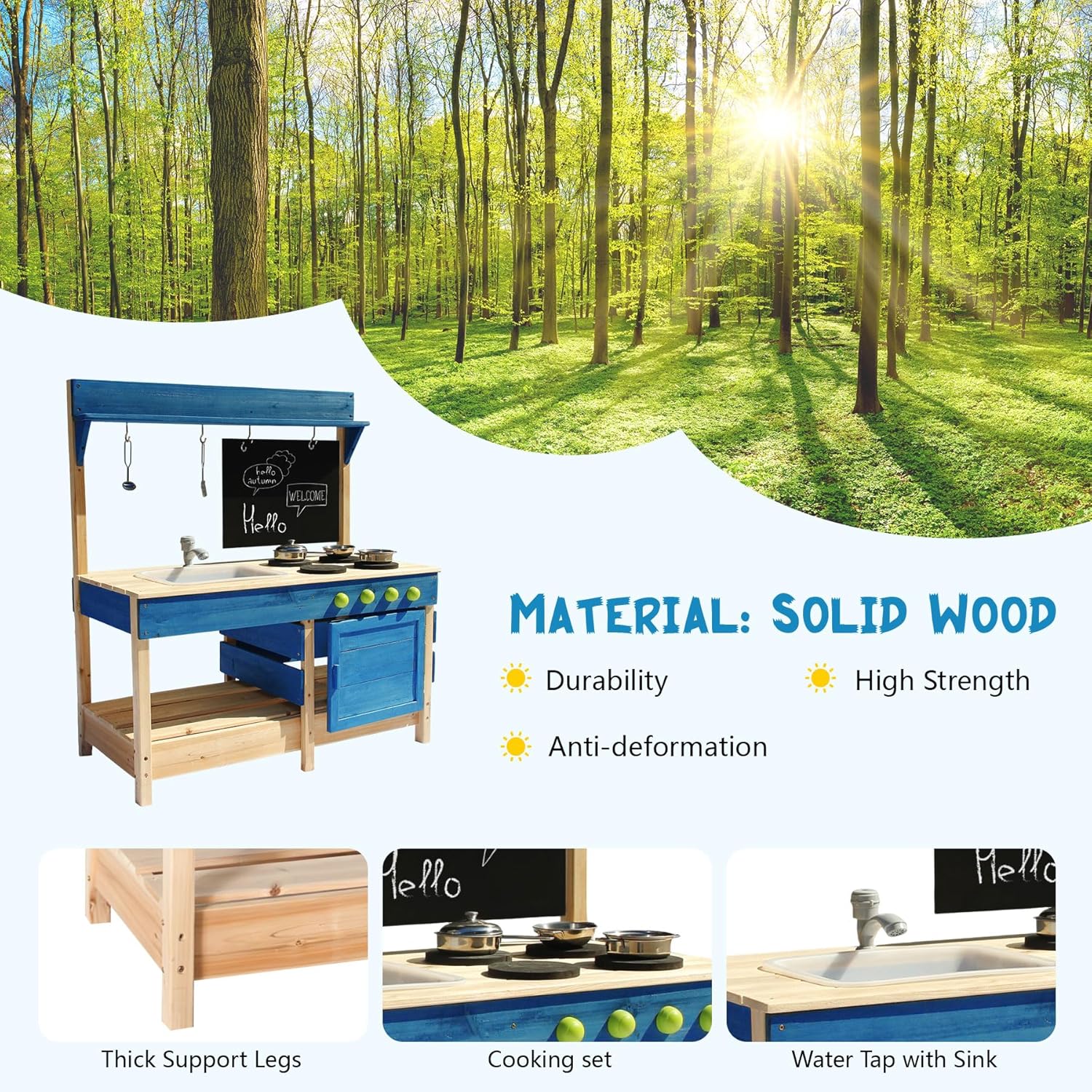 Mud Kitchen Playset for, Outdoor Wooden Toy Play Kitchen Set for Boys and Girls, Kitchen Accessories and Garden Sink with Faucet, Blackboard, Cookware Pot (Blue)
