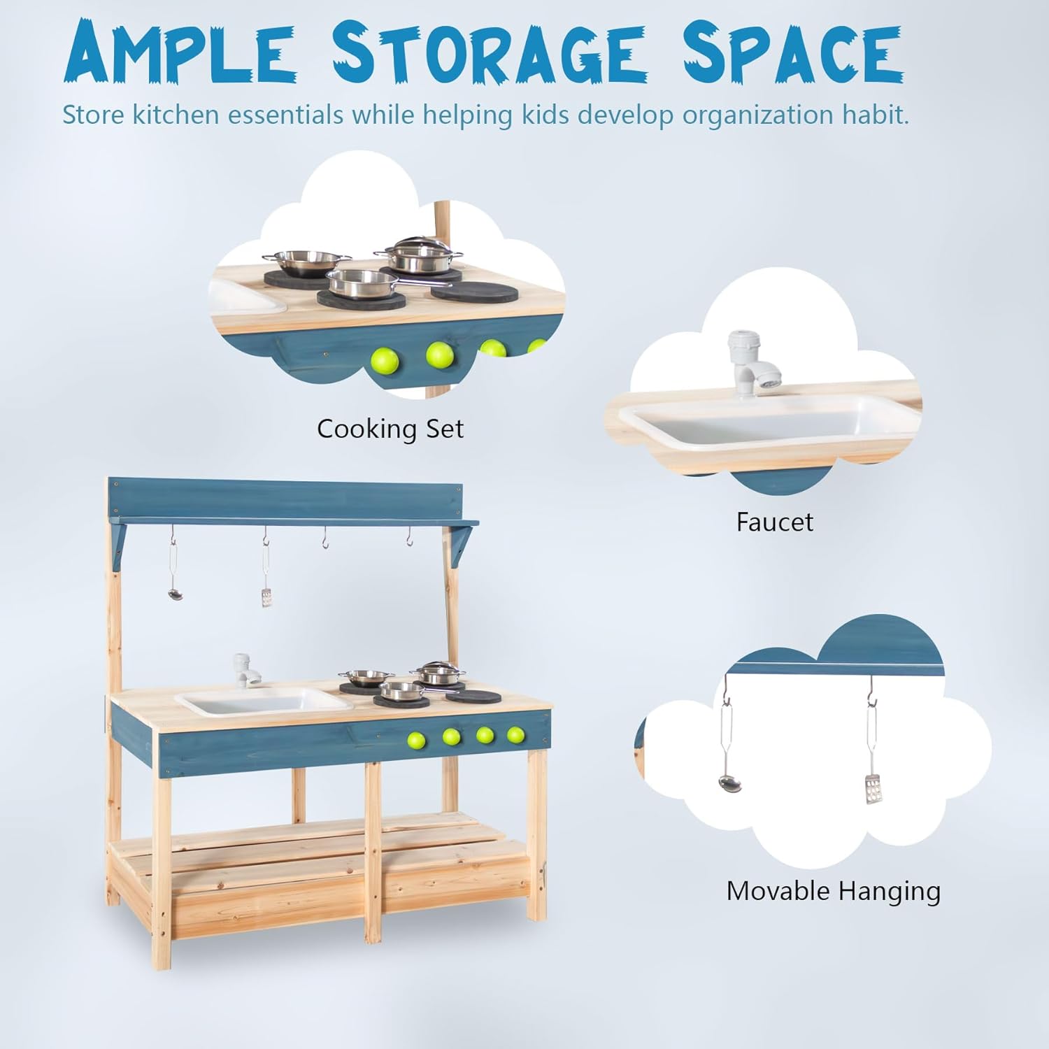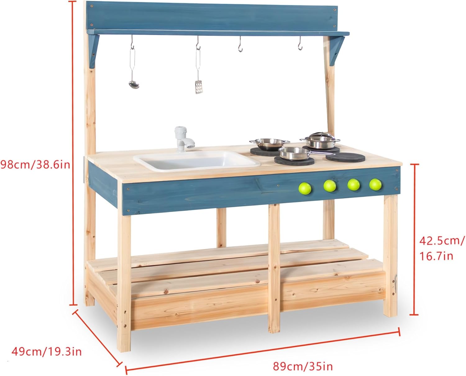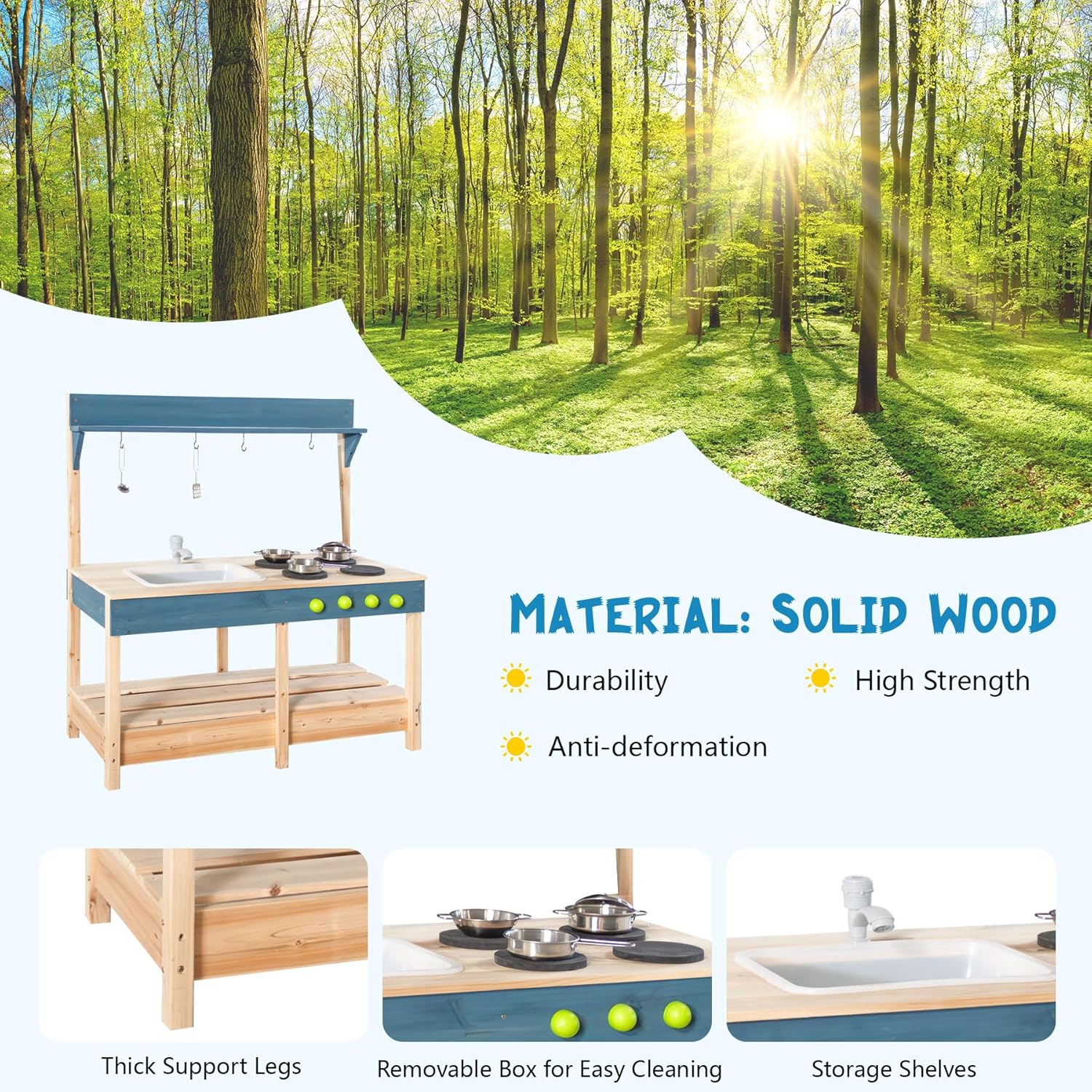 - Solid Pine Wood Material: Crafted from high-quality pine wood, our outdoor mud kitchen ensures durability and safety. Designed for toddlers aged 3 and above, it provides a secure and worry-free play environment.