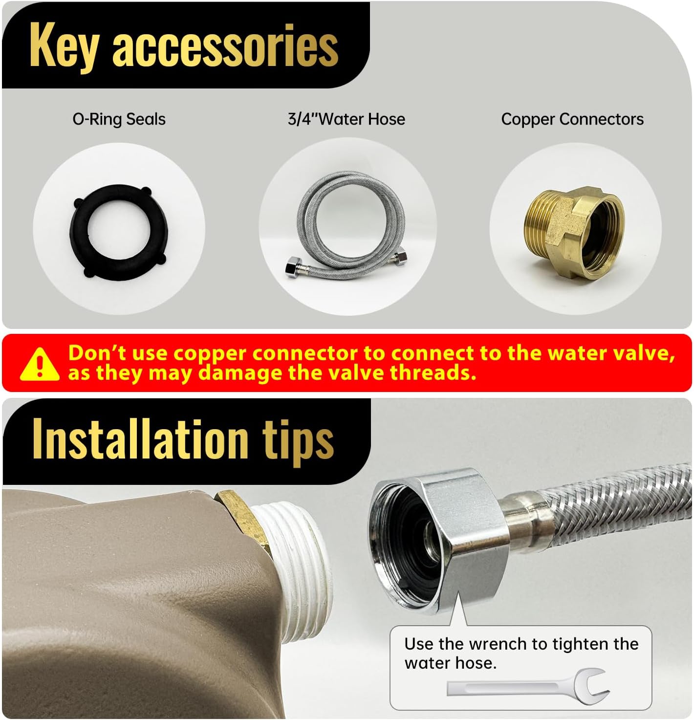 - Friendly Reminder: 1.In areas with high water pressure, the valve may malfunction. Please contact customer service for return. 2. If there is any water leakage at the hose connections, Please put two two"O"sealing rings in the copper connector. Copper connectors and "O"-ring seals are crucial components for addressing potential leaks. If it still leaks, consider the thread is not suitable