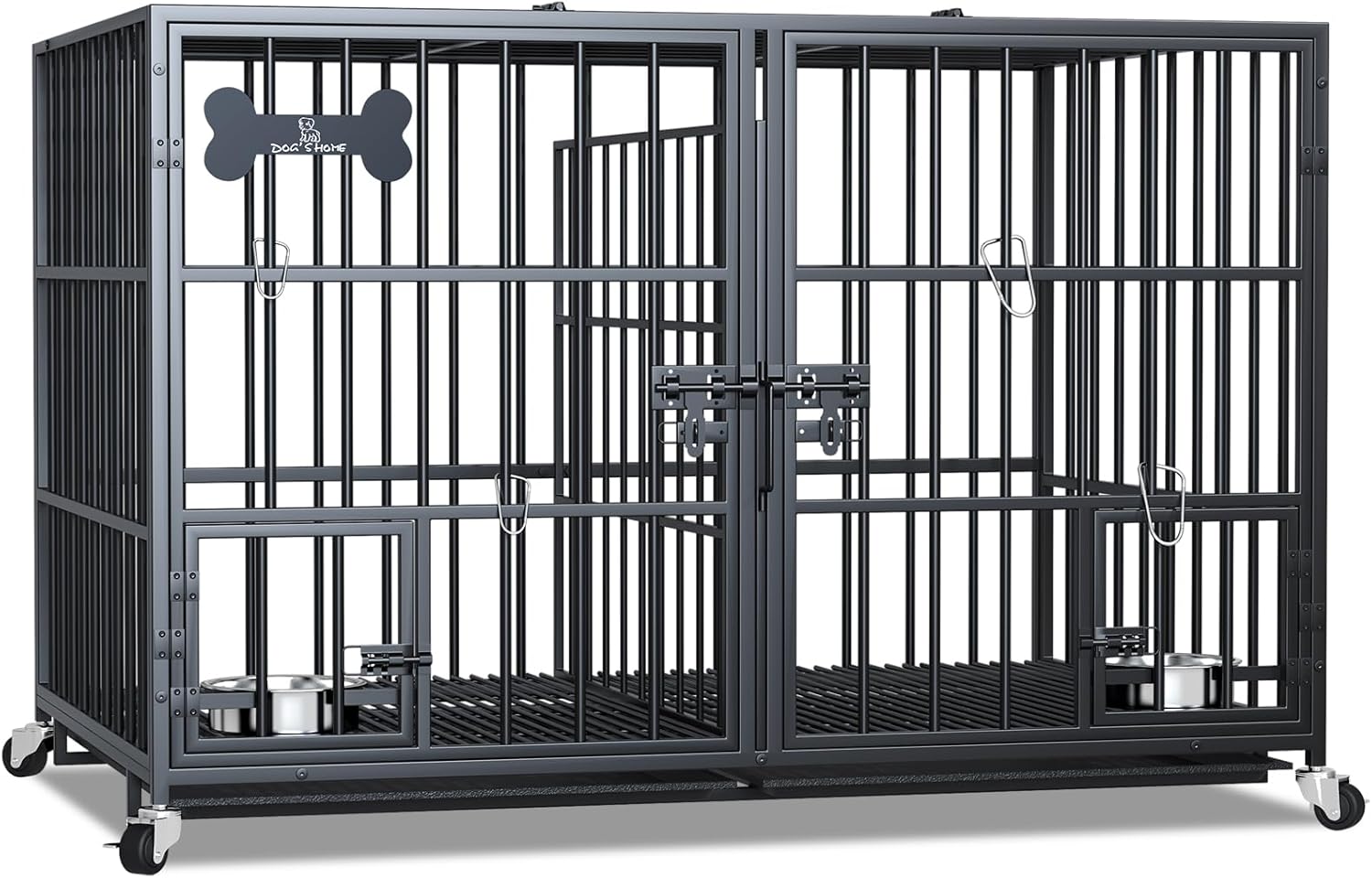 - 【Easy Access & Feeding】The dog crate has double doors and a reversible top for easy access almost anywhere. The top is open for easy access. The kennel is additionally designed with 2 small feeding doors with locks. These doors allow quick and easy access to the stainless steel dog bowl, swing bowl, without having to open the front door for easy feeding. The dog kennel double door design is not only easy to get in and out of the kennel, but also good for you to interact with and feed your dog.This crate has multiple ways to open the door, so you can experiment with agility and obedience, allowing them to grow faster.