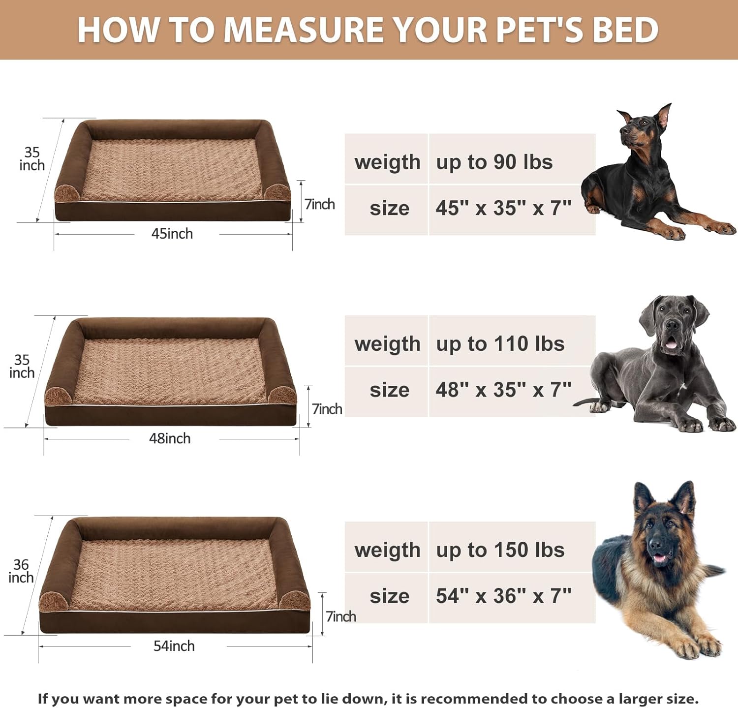 - DIMENSIONS (DOG BEDS FOR MEDIUM DOGS): jumber plus dog bed 54" x 36" x 7" (3.5" bolstered side ) for medium and large dogs up to 150 lbs. For dogs that like to roll around, sizing up will be more comfortable.