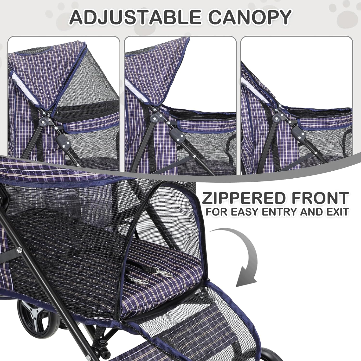 - Adjustable Comfort - Enjoy a customizable and accessible pet strolling experience with our stroller's adjustable canopy, breathable mesh windows, and a cozy padded interior for comfort, complemented by convenient dual-access zippered fronts for easy entry and exit.