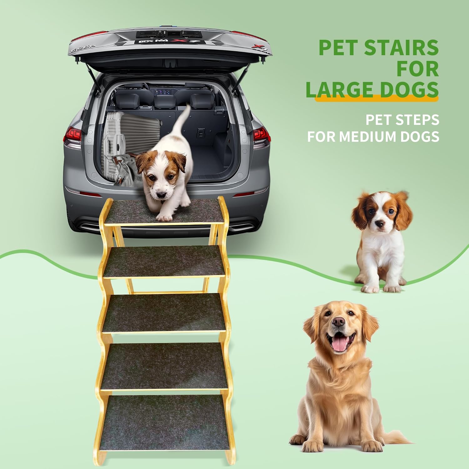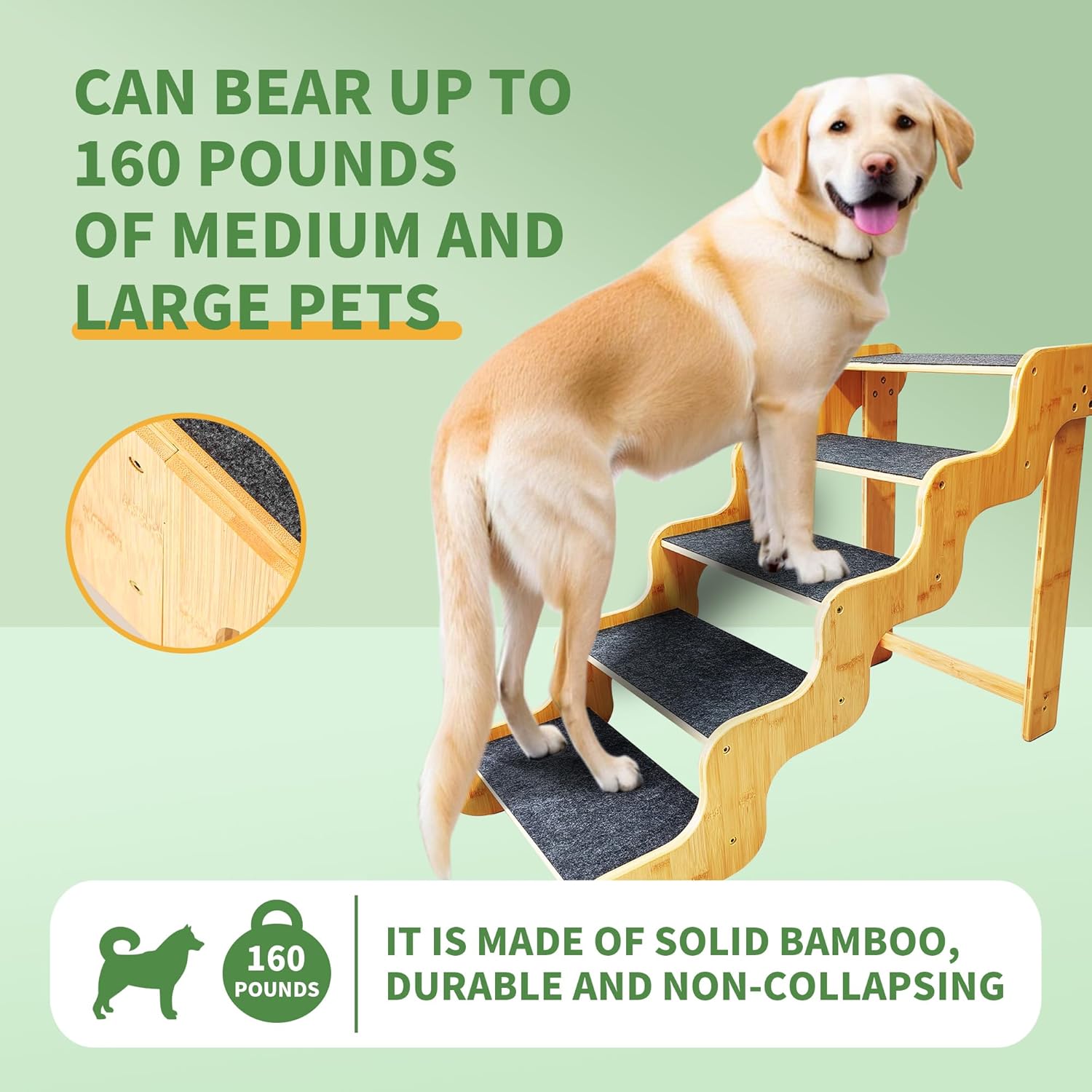 - [Natural Bamboo]The newest design of large dog steps are made of natural bamboo material. Each step tread in contact with the ground,are equipped with abrasion non-slip felts. With good thickness makes the dog stairs supportive、sturdy and durable. At the same time, the dog stair stable structural design adopts all kinds of large, medium-sized and small dogs and cats.