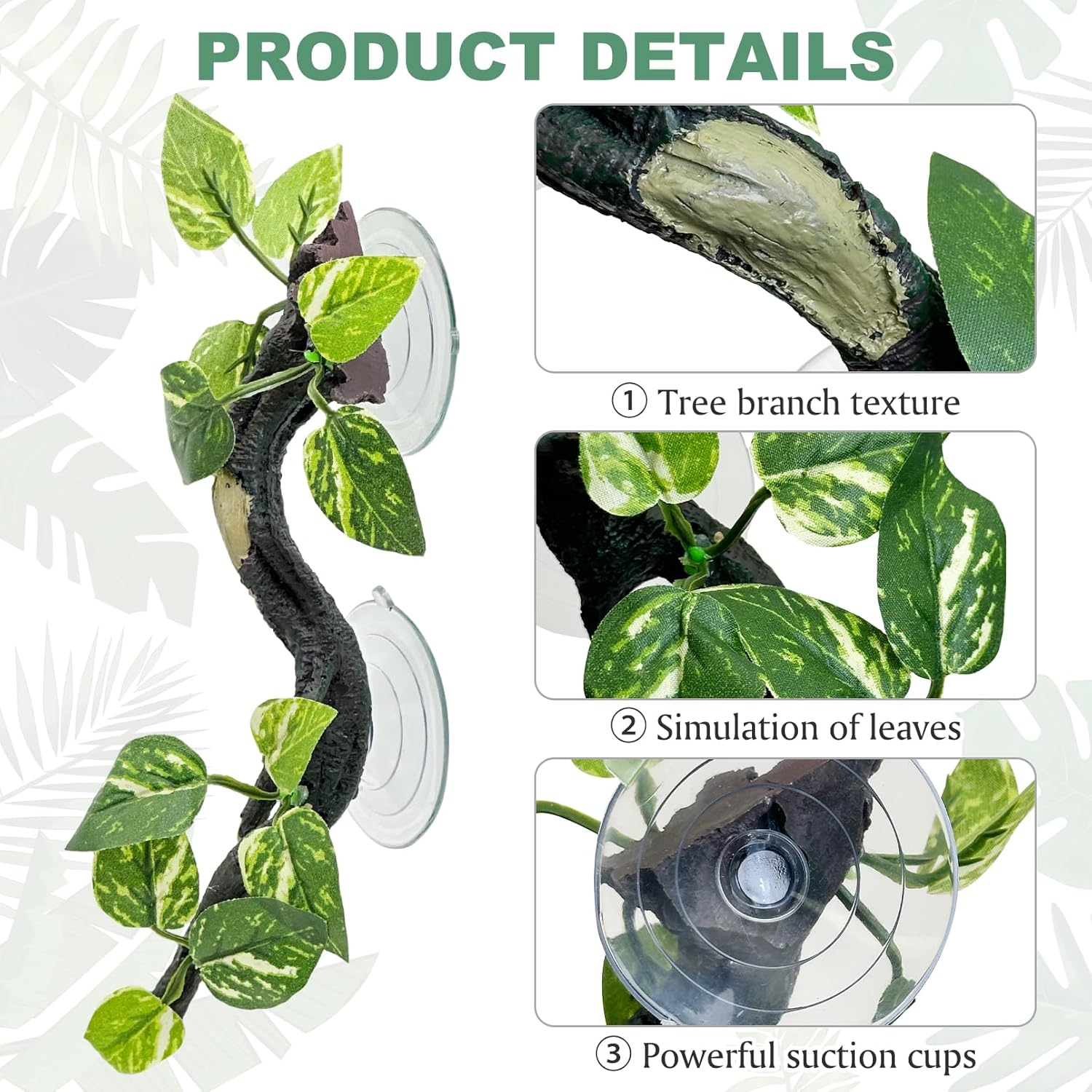- [Easy to Use]: Make sure the inside of the glass container is smooth and clean before use, place the fake plants for reptiles at the right height, press the suction cups to stick it on the inside wall, so that your bearded dragon has a solid climbing branch