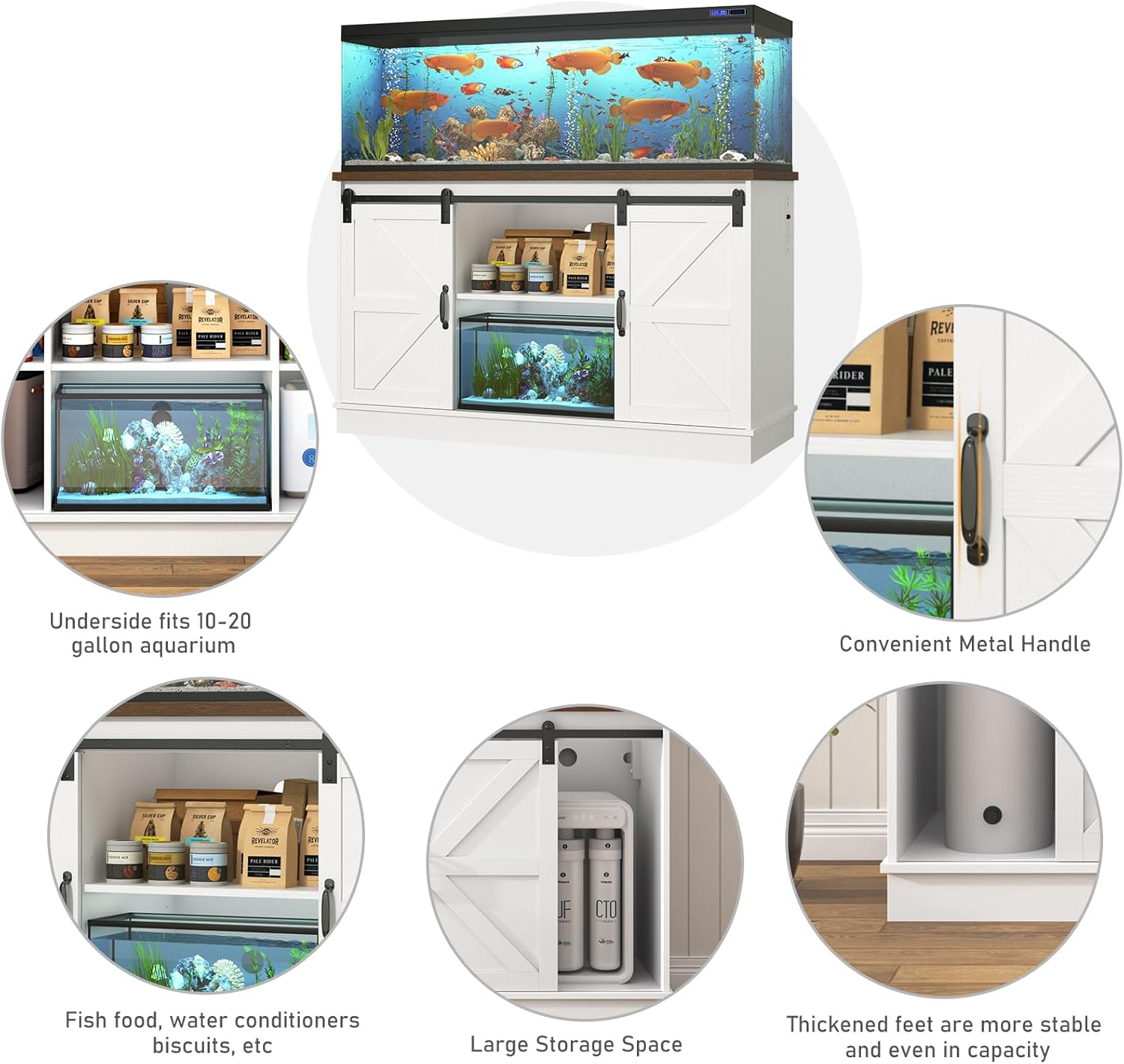 - Large Storage Space and Farmhouse Style: Our aquarium stand is designed as a 6-compartment storage space, and features 2 open storage and 4 hidden storage spaces, all including 3-position adjustable shelves. It is very convenient to can store various fish food, fishing nets, gravel cleaners, hoses, oxygen concentrators and cleaning tools. Our reptile tank stand also have metal handles and farmhouse metal sliding barn doors, which are convenient for switching open or hidden storage space back and forth. Bring more farmhouse-style decorative highlights to your home.