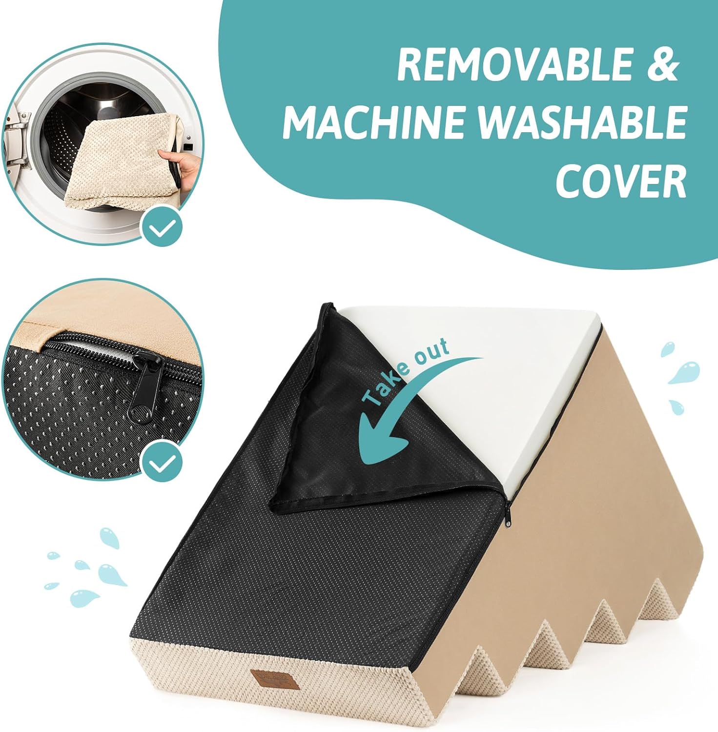 - Non-Slip Base and Removable Cover: Our dog steps for beds are equipped with a non-slip base featuring rubber dots for additional grip, minimizing movement during use. The pet steps cover is waterproof on the inner side, so you donβt have to worry about stains seeping into the foam. The outer cover is removable and machine washable for easy cleaning