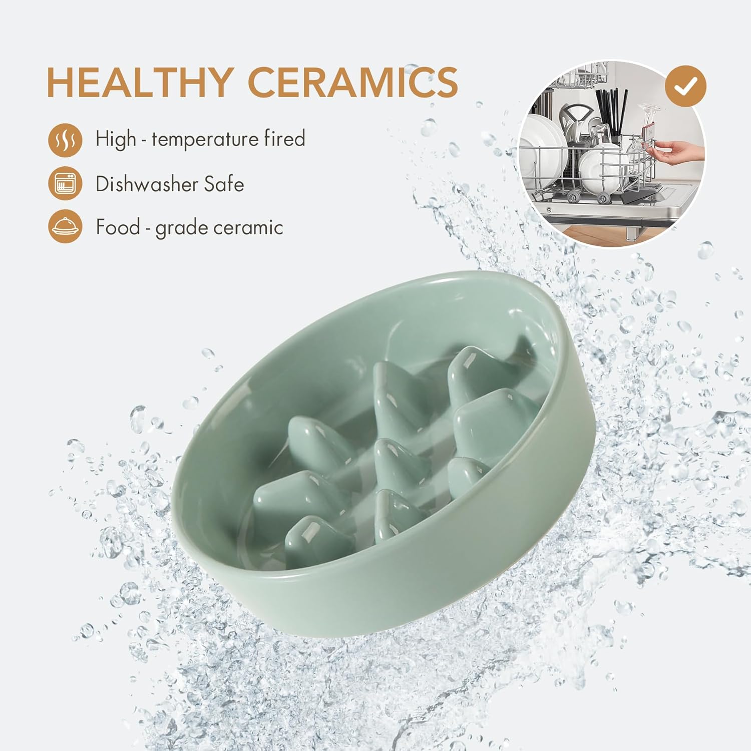 6.1inch Ceramic Dog Raised Slow Feeder Set, Elevated Bowl with Wooden Stand for Small Dog, Pet Slow Feeder Dish for Fast Easters, Anti-Gulping(Light Green, Single Bowl+ Stand)