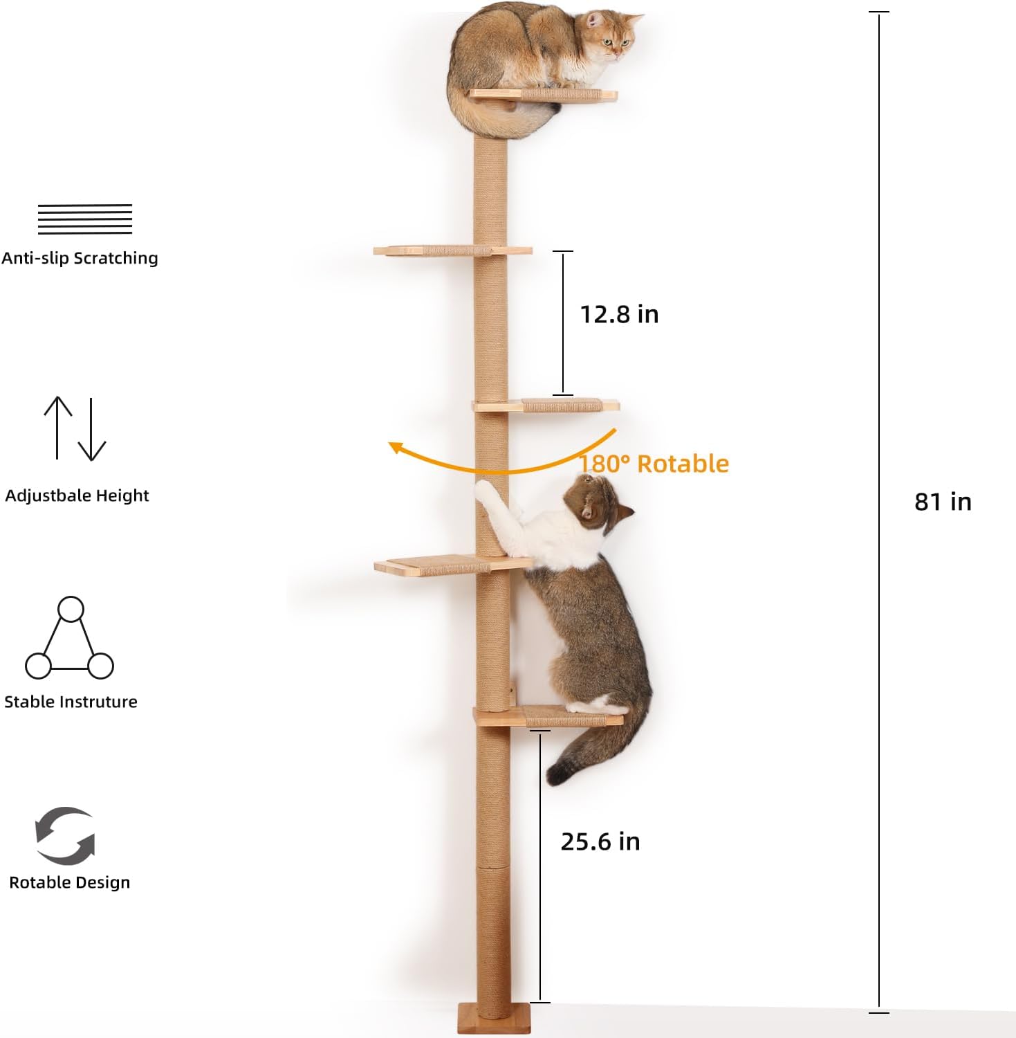 - DIY DESIGN - The scratching post of the cat tree is 360ยฐrotable. You can turn it over and use it on the other side when you find one side is worn. The adjustable height allows the tree to be customized, and the cat platform is not mounted to the wall, giving you the flexibility to DIY a spiral ladder for your cats.