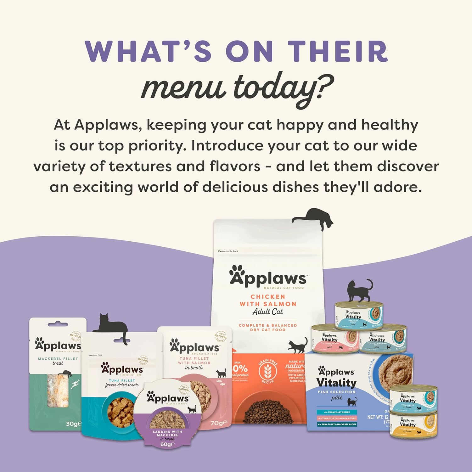 - Goodness in Every Bite: Our Cat Food recipes are packed with high-quality protein to fuel your cat's adventurous spirit. With real protein as the first ingredients, Applaws Vitality is a premium cat food that provides the nutrition and energy needed to keep your cat satisfied, healthy, and excited for every meal.