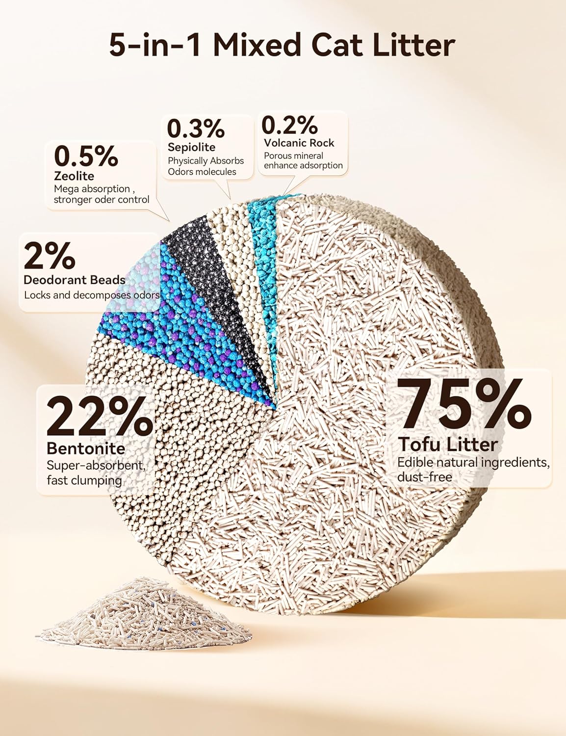 - 【5-in-1 Mixed Cat Litter】Meowant mixed cat litter adopts a scientific ratio, combining 75% tofu cat litter, 22% bentonite cat litter, 2% blue-purple deodorant beads, and adds zeolite, crushed mineral sand to improve stability. Mixed clumping cat litter is ideal for multi-cat households.