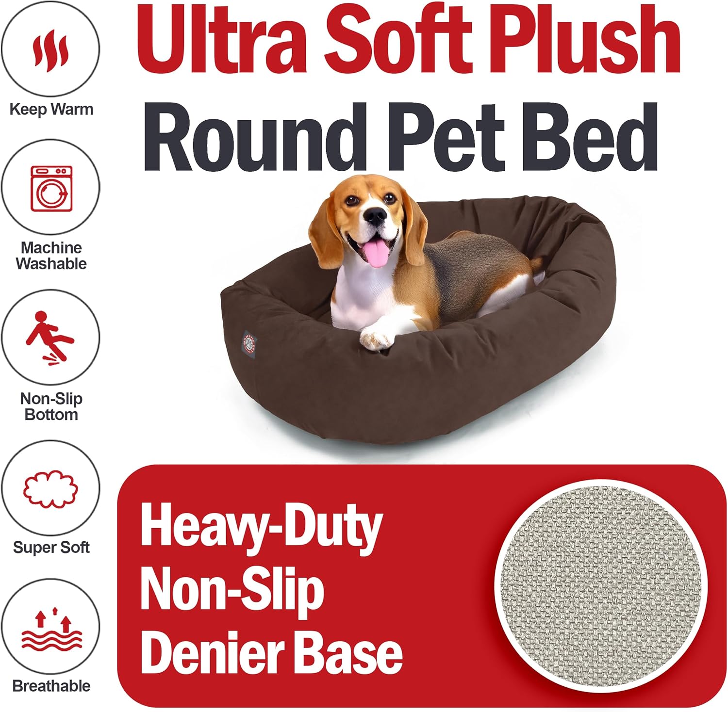 - [Elegance meets durability] - Crafted with premium high-loft polyester fill, the Majestic Pet dog bed offers a regal sleeping experience, lasting quality, and exceptional loft and coziness. The cushioned pillow adds an extra layer of comfort to pamper your pet. No more compromising on comfort, style, or ease of cleaning. Upgrade your pet's lifestyle today with our round dog bed.