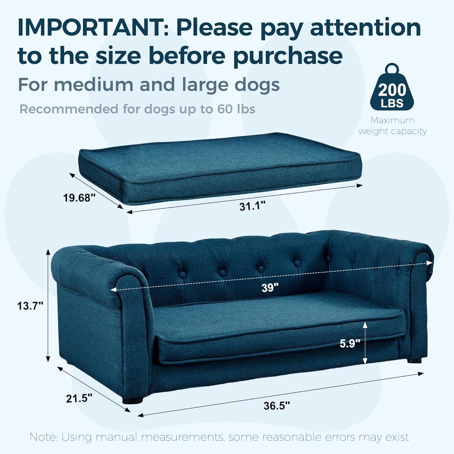 - Warm tips: The size of the large dog couch is 38.9" x 23.2" x 13.7". Cushion size: 19.68" D * 31.1" W. Maximum weight capacity is 200 lbs. Suitable for medium and large dogs, not suitable for extra large dogs. Please pay attention to the size of the product before shopping.