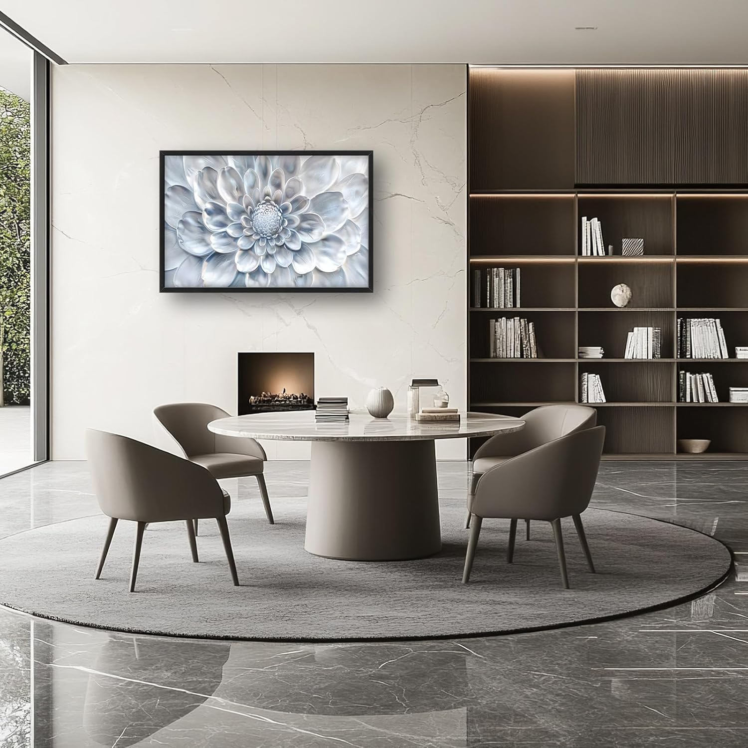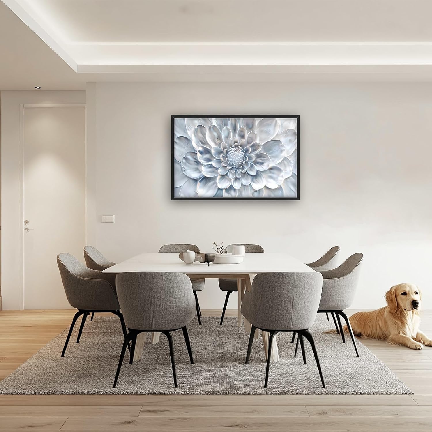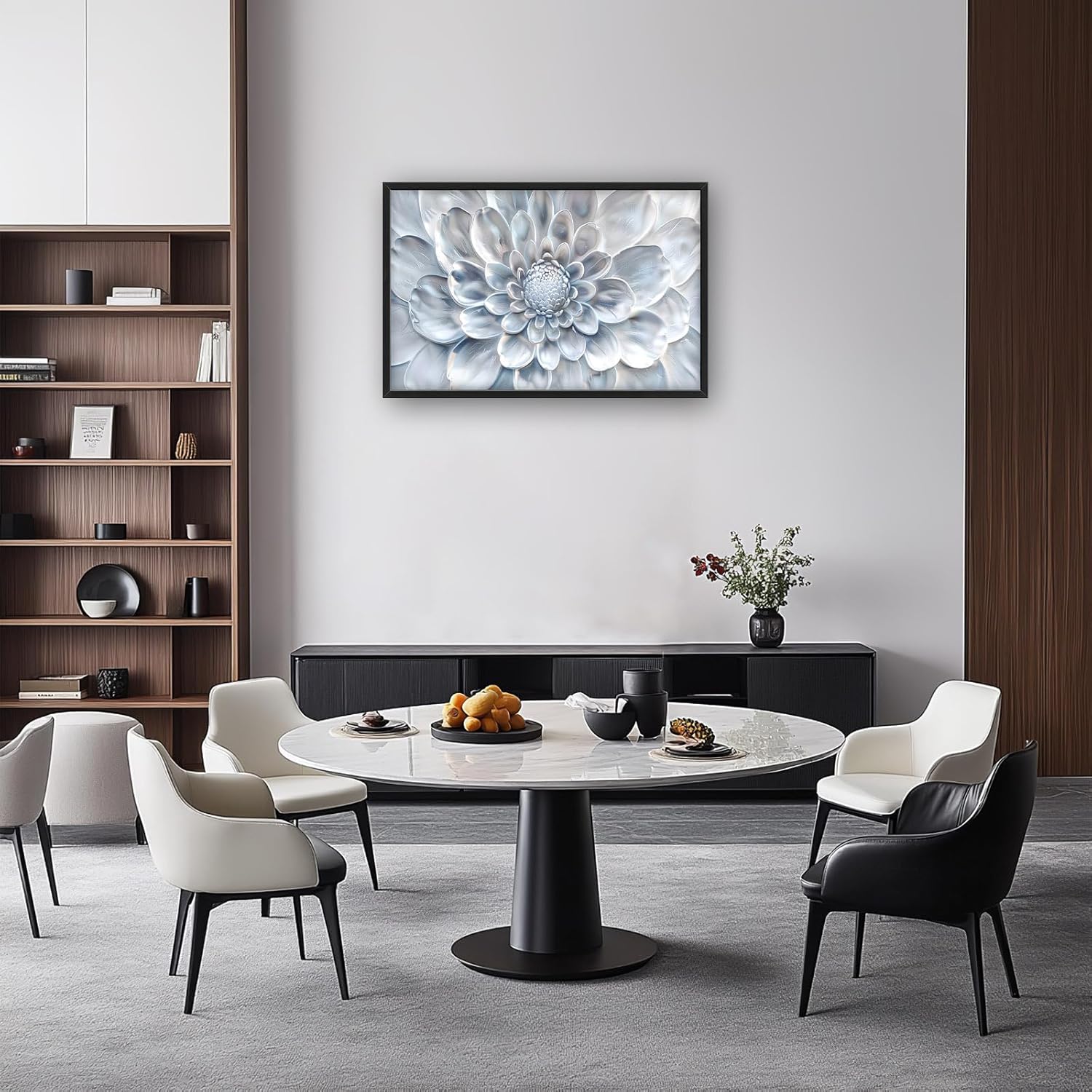 - 【Unique Design】A close-up of an elegant dahlia flower, its petals rendered in soft silver tones and delicate textures, creating a sense of depth that emphasizes the intricate details of each petal. The background is a subtle gradient from light grey to pale blue, adding a touch of sophistication to the overall composition. This image captures the essence of modern wall art with a focus on realism and high-resolution detail.
