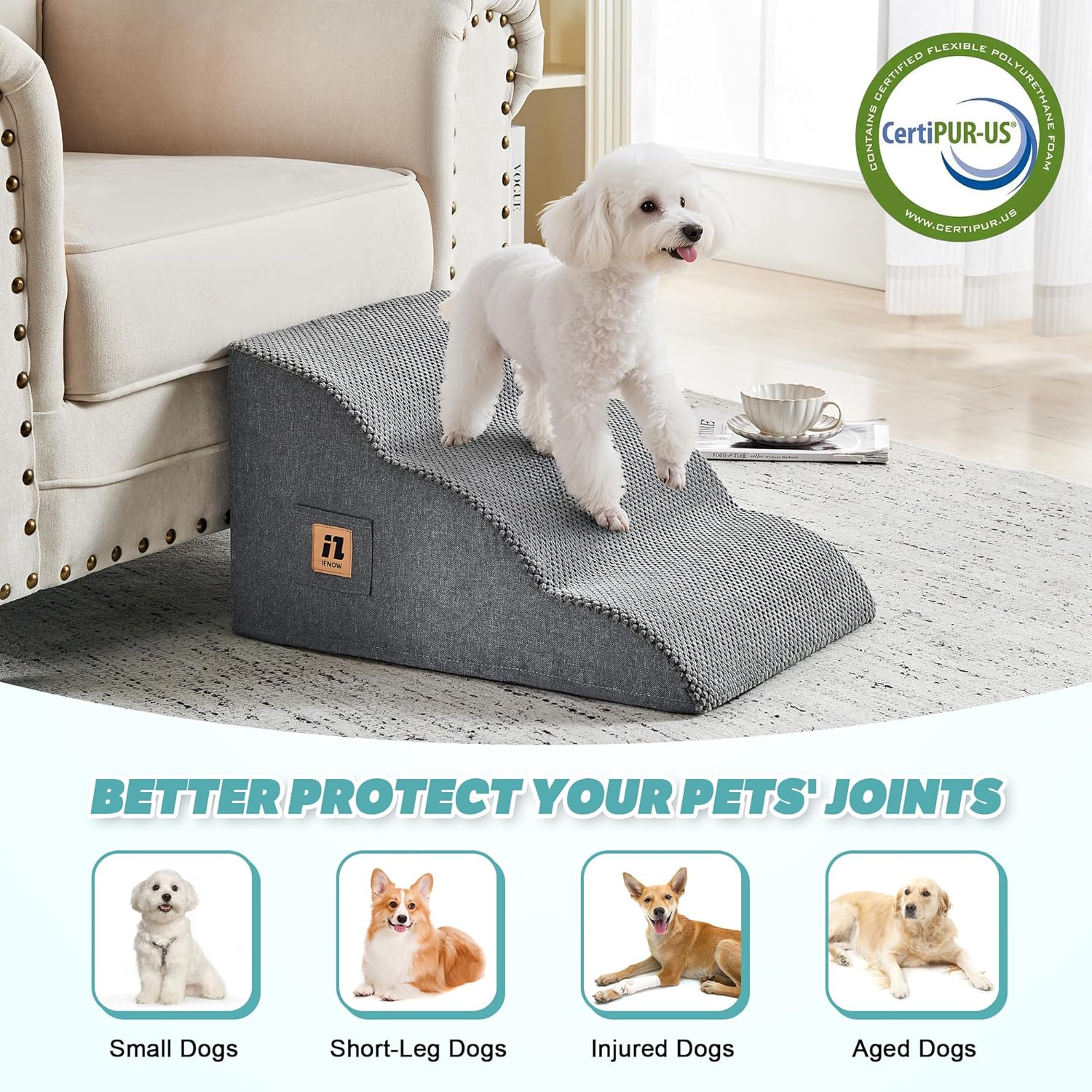 IFNOW Dog Stairs for Small Dogs and Cats 11.8" H, 3-Step Sturdy Dog Steps for Couch, Sofa or Chair, High-Density Foam Pet Stairs for Puppy, Older Cats, Non-Slip Curved Pet Ramp Indoor, Grey