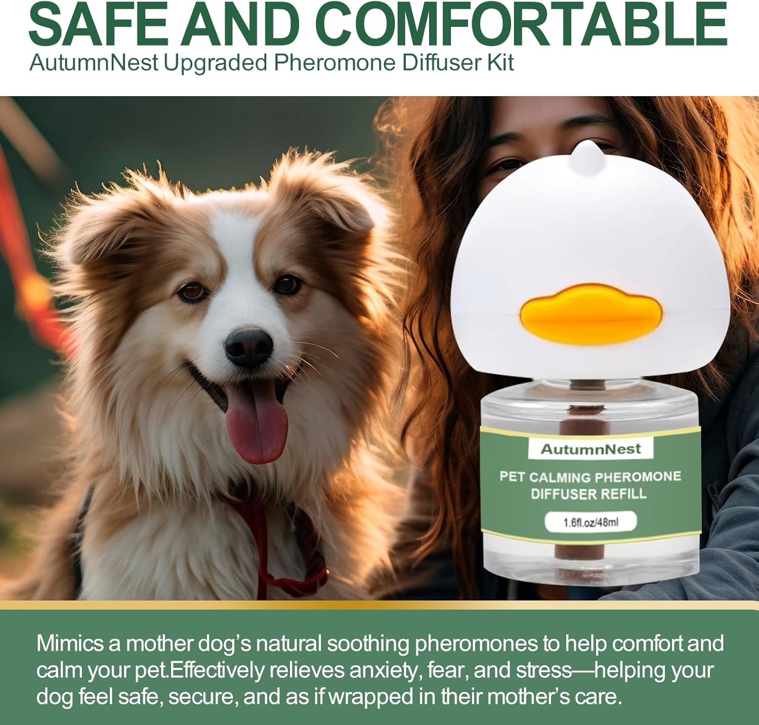 - 【4-in-1 Dog Calming Diffuser Kit – Ideal for 90-Day Stress Support】 AutumnNest calming kit includes 1 plug-in diffuser and 3 x 48ml refills, providing up to 90 days of continuous stress relief for your dog. Designed to help reduce anxiety-related behaviors like pacing, whining, and barking, this long-lasting system is ideal for maintaining a peaceful environment at home.