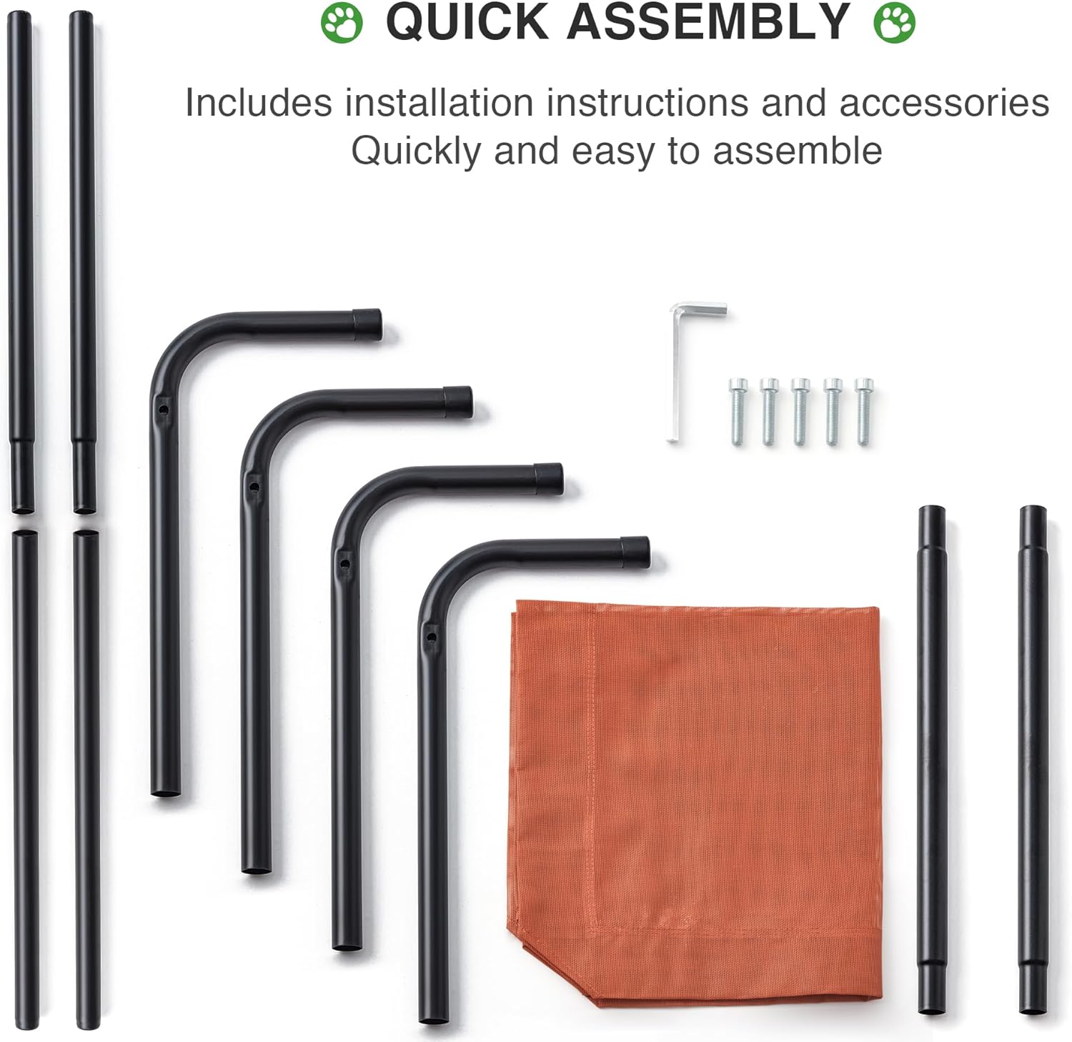 - EASY TO ASSEMBLE: Easy to assemble and disassemble for transport, including: 1 mesh, 4 legs, 2 leg extension rods, 4 cross support extension rods, 4 screws (WONโT rust) and 1 hex key. Off-the-ground design is perfect for both indoors and outdoors, you can place a dog pad on top of the mesh like a mattress to make it softer in your living room, also it is convenient for traveling, camping, hiking, fishing, BBQ, etc .