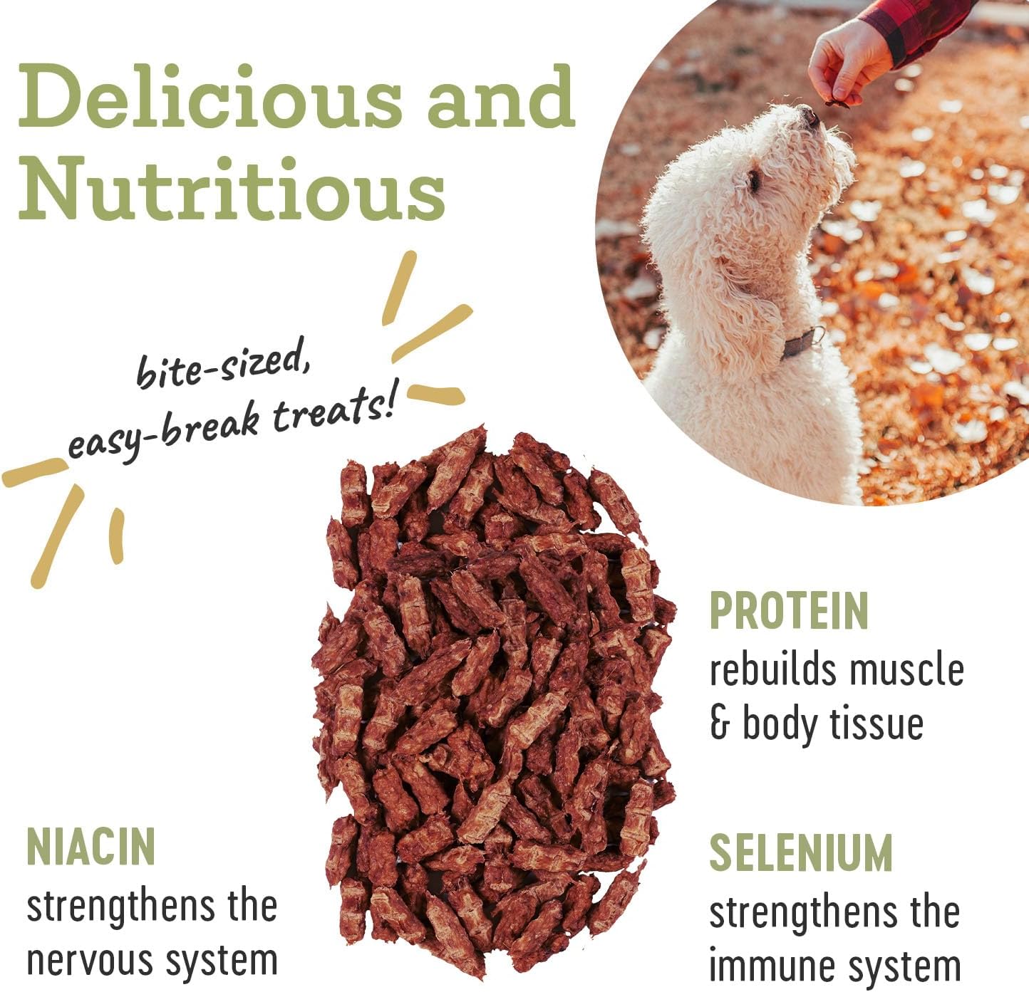 - HEALTH & NUTRITION - Our Boar Trainers jerky treats are full of vitamins and minerals. Selenium helps strengthen the immune system, leading to healthy skin and a shiny coat. Niacin supports a healthy nervous system, aiding in the metabolism of carbs, proteins and fats. Iron supplies nutrients and oxygen throughout the body. And healthy levels of protein to help build and repair your dog's muscles and body tissue.