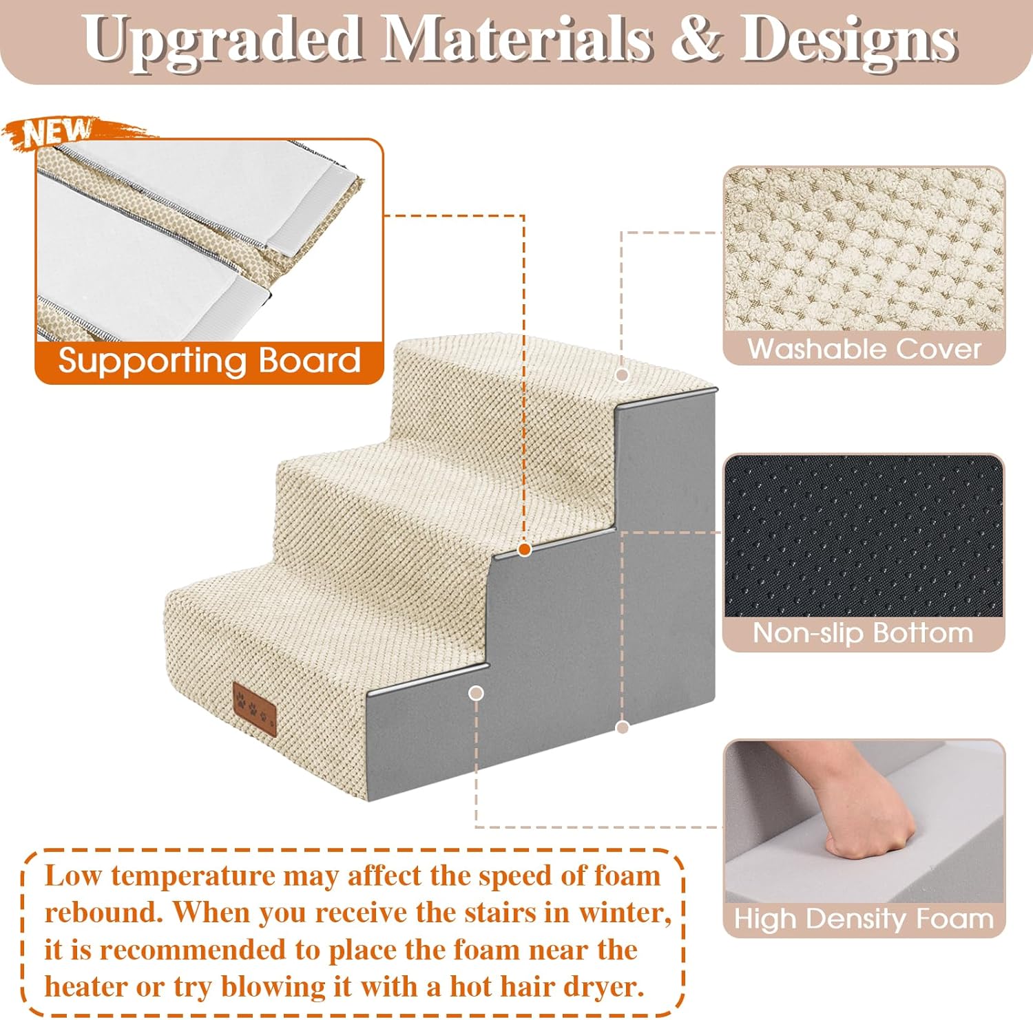 - 【ENHANCED STABILITY】 GGIB dog stairs improve a new design with supporting boards, added between the foam stairs and the removable cover. They are fixed inside the cover. Dogs can step on more stable and supportive stairs surface, preventing them from slipping when moving quickly.