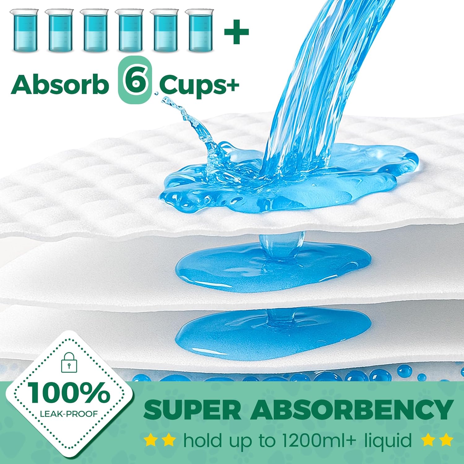 - SUPER ABSORBENT DOG PEE PADS: Extra large pee pads for dogs with super absorbent polymer(SAP) technology are more absorbent than previous dog potty pads, the water absorption capacity of each xlarge puppy pad above 1200+ milliliters (hold up to 6 cups or more of liquid)– keeps paws dry and floors stain-free.