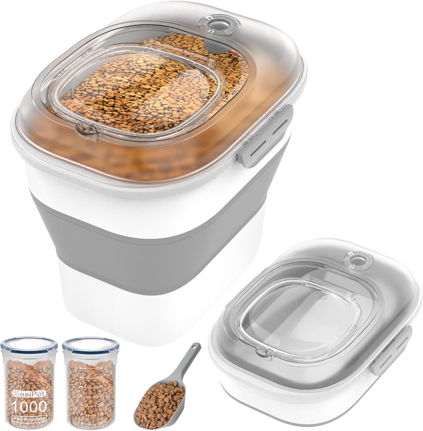 - What You Can Get: The pet food container comes with 1 pet food scoop and 2 smalcontainers for easy serving. Support all the parts you need. And this thoughtful dogfood holder storage set with a beautiful box is an ideal choice for any family.
