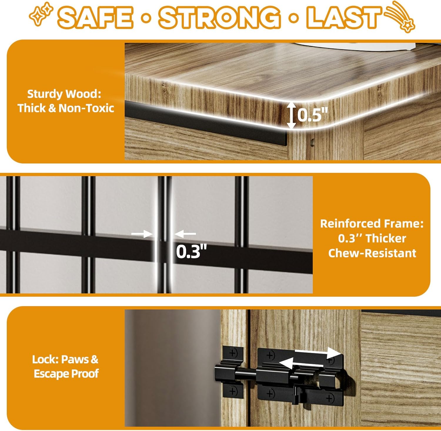 - Chew-Resistant & Durable Structure: Built with 0.3" reinforced steel bars and a 0.5" thick solid wood base. Supports long-term use without warping or breaking—even with energetic large dogs