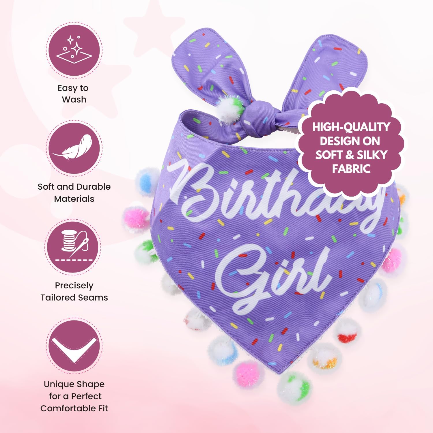 LunaMarie - Luxury Pet Birthday Bandanas -Premium & Silky Poly Fabric | 100% Handmade | Custom Shape Dual Layered (Birthday Girl Purple, Large)